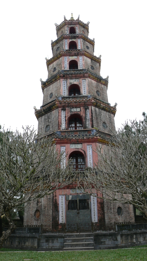 Nach dem Mittagessen fahren wir zur Chua Thien Mu, der Pagode der himmlischen Mutter, einem Symbol der Stadt Hue. Der Legende nach soll an dieser Stelle allnächtlich eine Frau erschienen sein, die den Bau dieser Pagode vorhergesagt hat, woraufhin der Fürst Nguyen Hoang sie 1601 errichten ließ. Sie liegt auf einem steilen Hügel, zu dem hohe Treppenstufen hinauf führen.