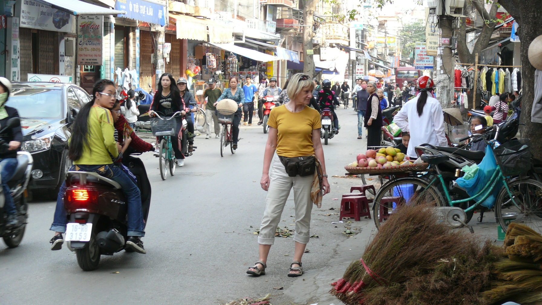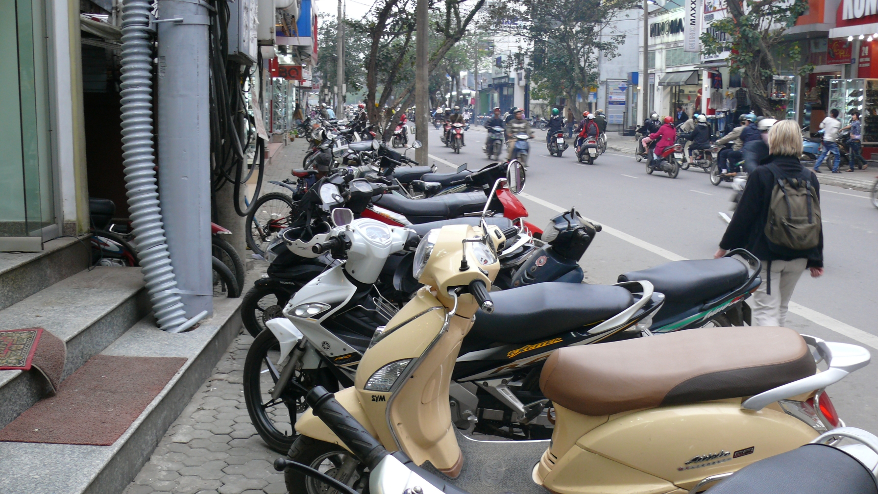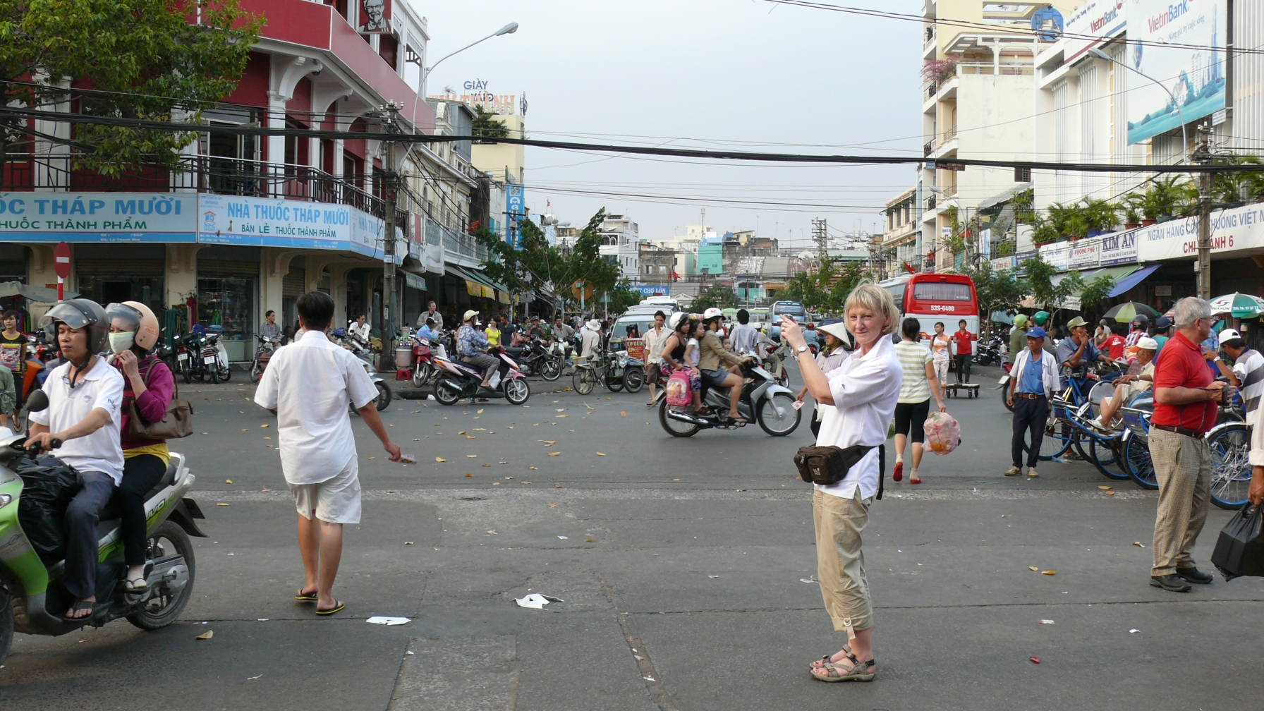 Um zu einem Geldautomaten zu kommen, müssen wir die Straße überqueren. Sie ist breit und dicht befahren. Sicherheitshalber schließen wir uns drei jungen Vietnamesinnen an, die uns auf dem kürzesten Weg schräg über die gesamte Kreuzung mitten durch den fließenden Verkehr auf die andere Straßenseite bringen. Bis auf ein paar Nerven, die wir gelassen haben, sind wir unbeschadet. Man muss wirklich zielstrebig und gleichmäßig gehen und vielleicht auch nicht so viel nach rechts und links schauen – dann klappt das schon. Den Rückweg schaffen wir auch schon allein. Hue ist zwar nicht so weltstädtisch wie Ho Chi Minh City, dafür ist der Straßenverkehr vielleicht sogar noch chaotischer.