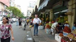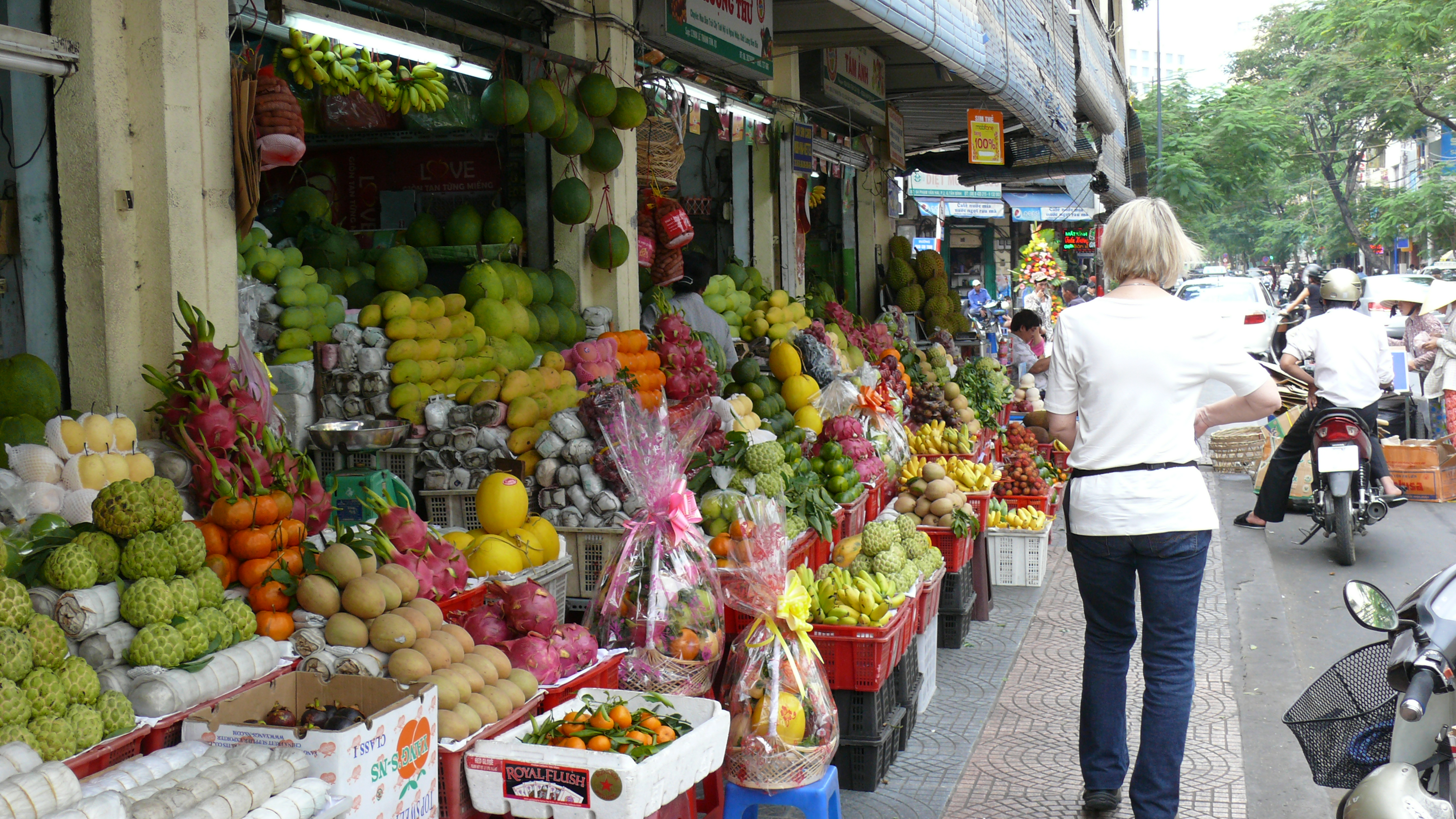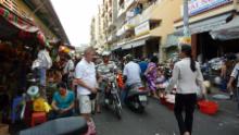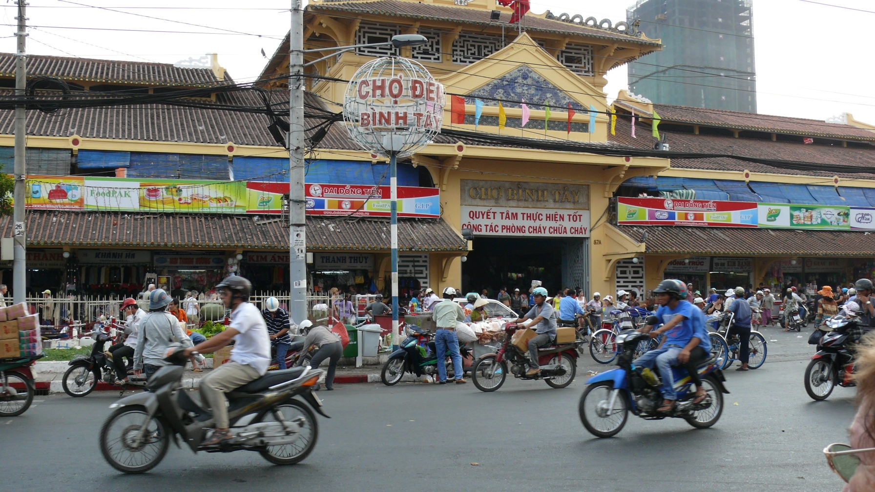Danach stürzen wir uns in das Getümmel von Cho Binh Tay, dem Großmarkt von Chinatown. Hier werden Waren jeglicher Art gehandelt, allerdings in Großhändlermengen. Sich durch die engen Gänge zu quetschen, ist ein Abenteuer für sich. Mindestens genauso abenteuerlich ist es natürlich, über die Straße zurück zum Bus zu kommen!