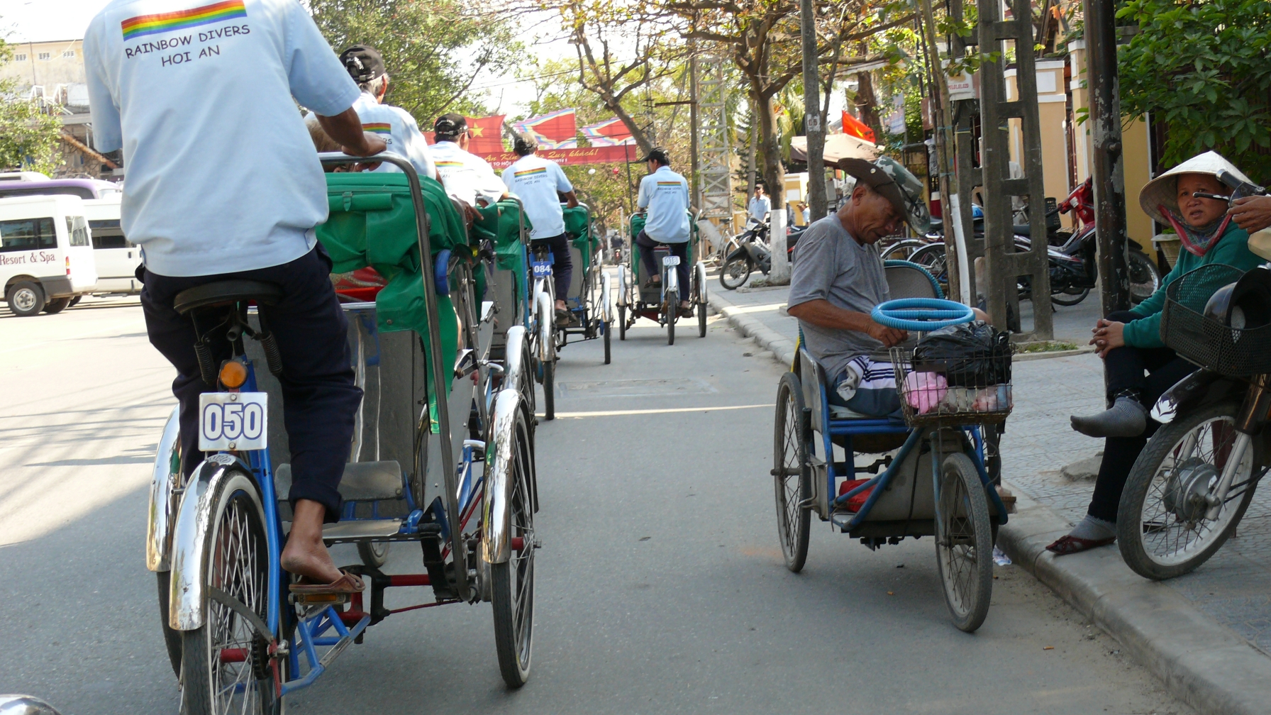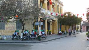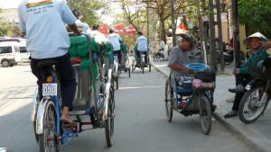 In einem Fahrrad-Rikscha-Konvoi (18 Menschen, jeder eine Rikscha) erkunden wir dann die Altstadt von Hoi An. Erstaunlich leicht fädeln sich die Radfahrer in den Verkehr ein. Weil sie keine Hupe haben, müssen sie zu anderen Mitteln greifen. Einer hat eine Glocke dabei, und mein Fahrer ruft beständig „Hep, hep, hep“.