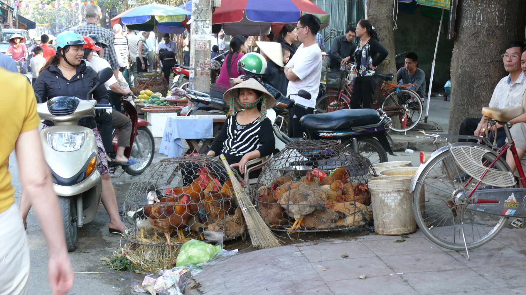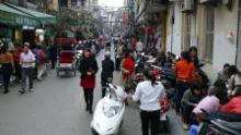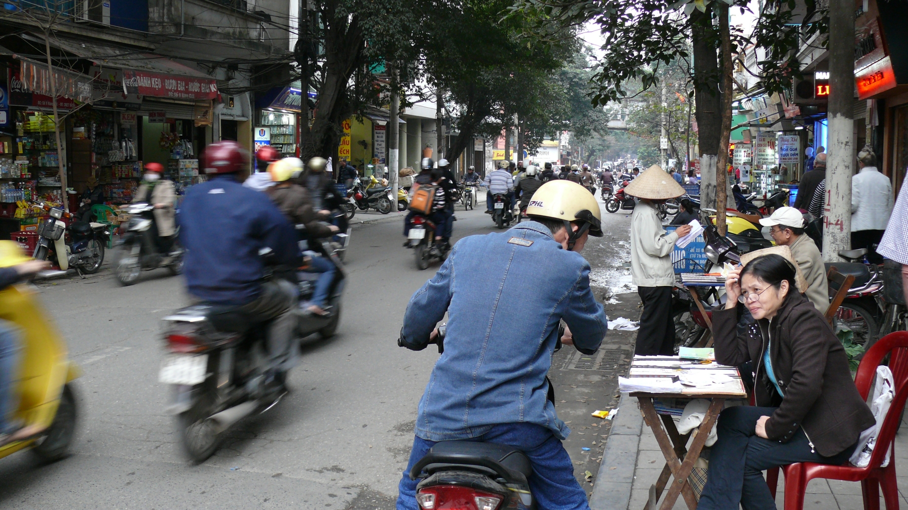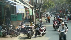 Viel interessanter ist es aber, das Leben auf den Straßen zu beobachten. Unendlich viele Mopeds und Motorroller füllen die Straßen, so dass es auf den ersten Blick kein Durchkommen gibt. Der Straßenverkehr wirkt hektisch und chaotisch, aber im Grunde geht alles ganz friedlich zu, und magischerweise fließen die verschiedenen Verkehrsströme irgendwie ineinander. Die Reisegruppe wird zwar bei diesem ersten Ausflug sicherheitshalber von Polizisten über die Straße geleitet, aber die individuelle Feuerprobe haben wir auch schon bestanden: Man kommt tatsächlich unbeschadet durch den fließenden Verkehr von einer Straßenseite zur anderen, wenn man ruhig und stetig hinübergeht. Wir haben dies in den Reiseführern und –berichten immer wieder gelesen, allerdings nicht so recht geglaubt. Es ist aber tatsächlich so. Trotz des immens dichten Verkehrs nehmen alle sehr viel Rücksicht aufeinander – auf rote oder grüne Ampeln sollte man sich jedoch lieber nicht verlassen. Nachvollziehbar ist freilich nun auch, warum Touristen hier nicht Autofahren dürfen!
