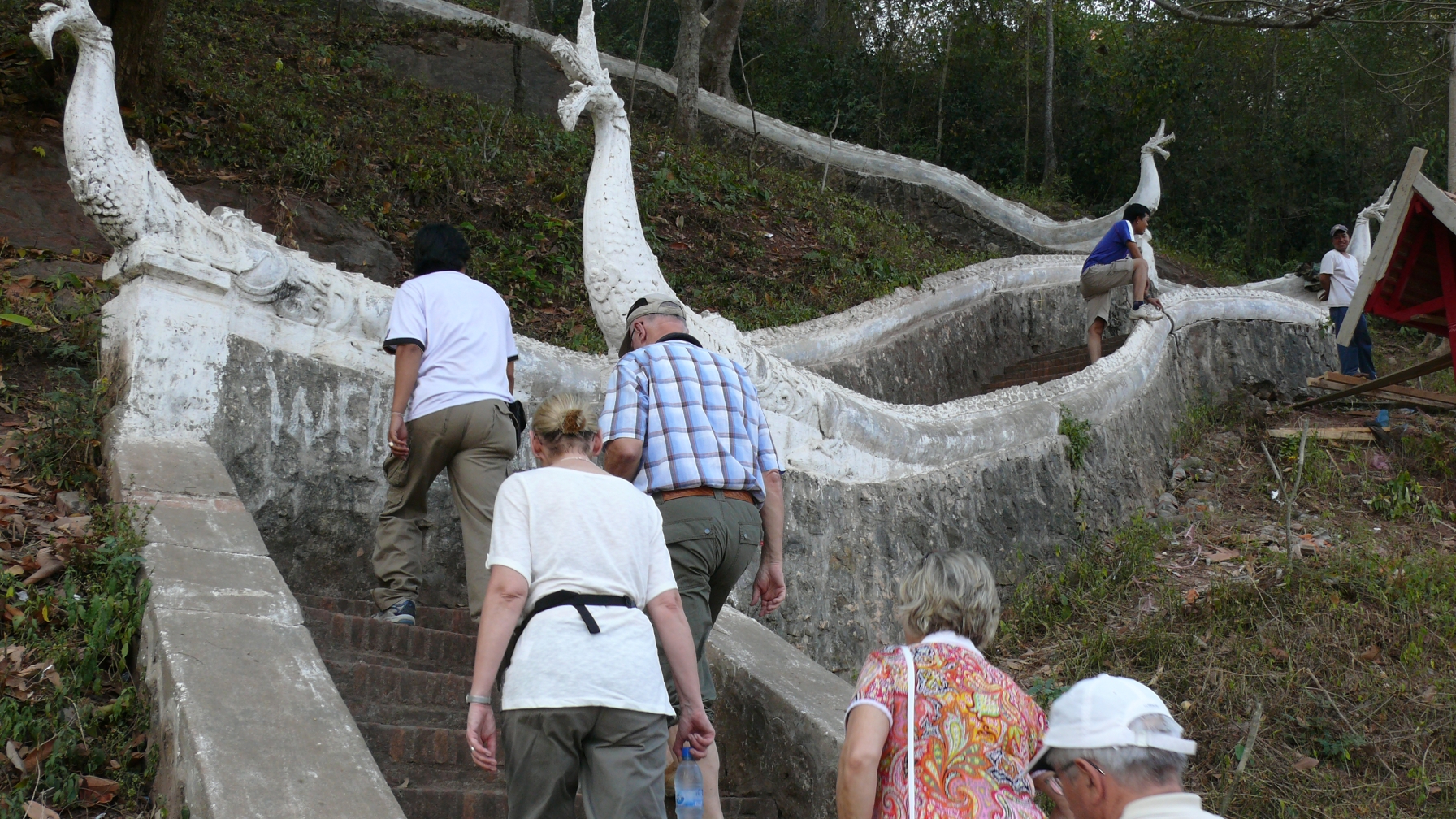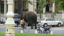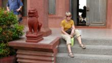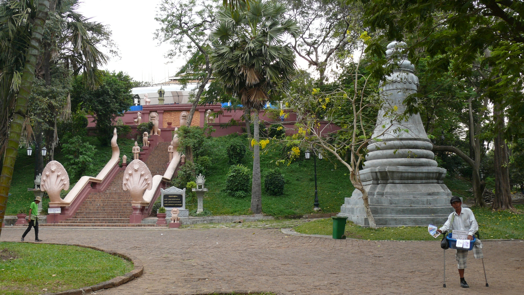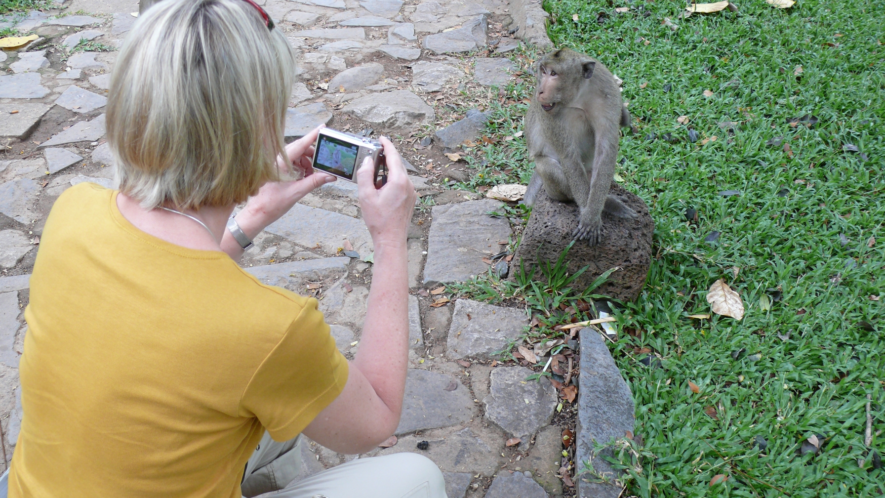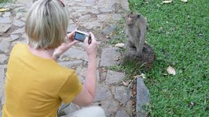 Letzte Station der heutigen Besichtigungstour ist der Wat Phnom (Tempel auf dem Berg), wohl das wichtigste lokale Heiligtum in Phnom Penh. Hier wird auch die Stifterin der Pagode und Namensgeberin der Stadt, Frau Penh, verehrt. Leider sind die Bauten wegen Bauarbeiten gesperrt, und so bleiben die vielen Affen, die den Hügel bevölkern, die Hauptattraktion. Sie lassen sich gern füttern und fotografieren, aber wenn man ihnen zu nahe kommt, greifen sie auch an. Ulrich muss diese Erfahrung machen, glücklicherweise wird er nicht gebissen.