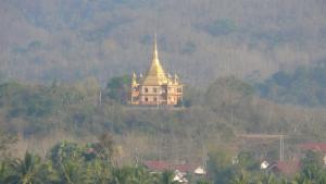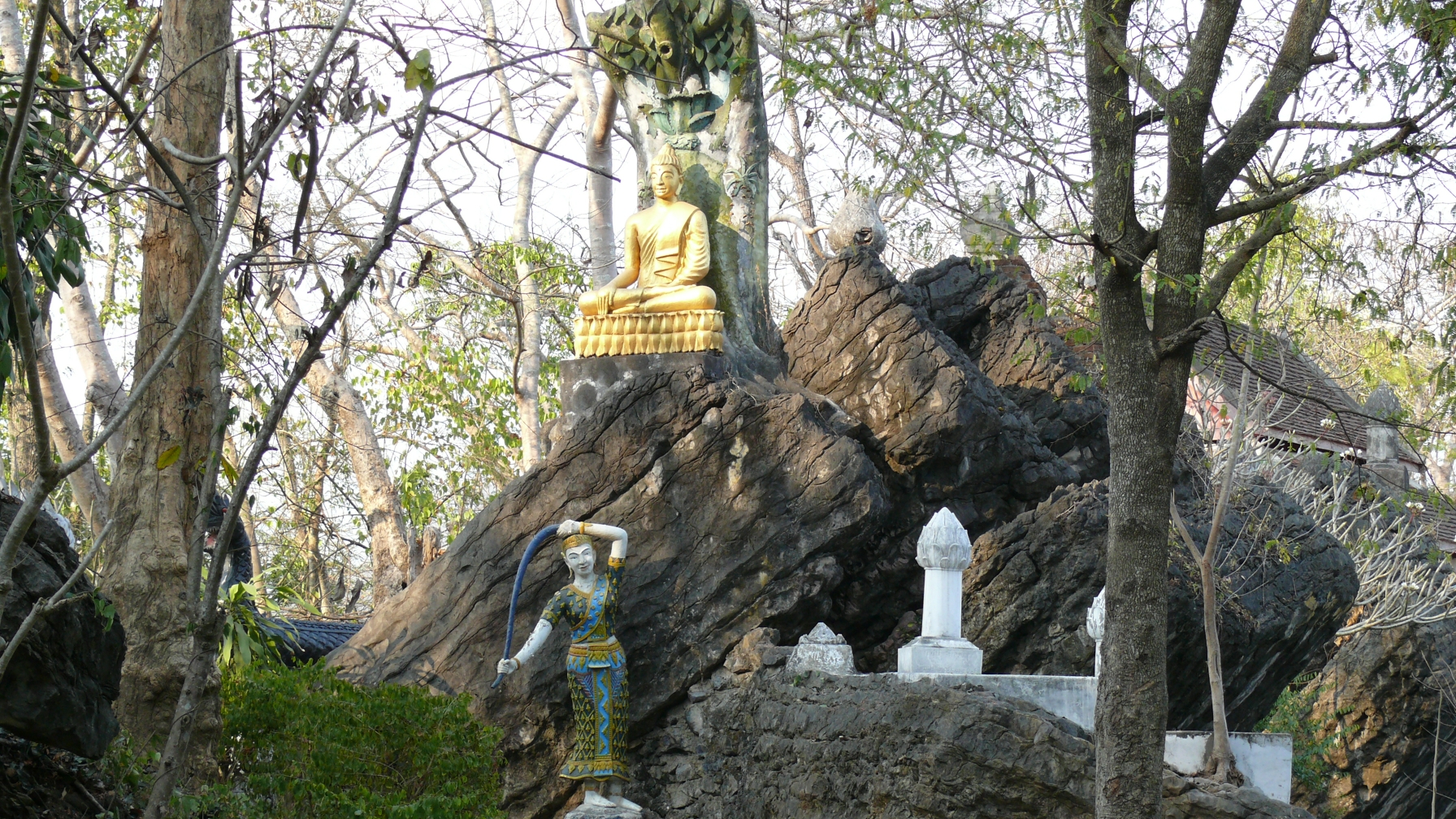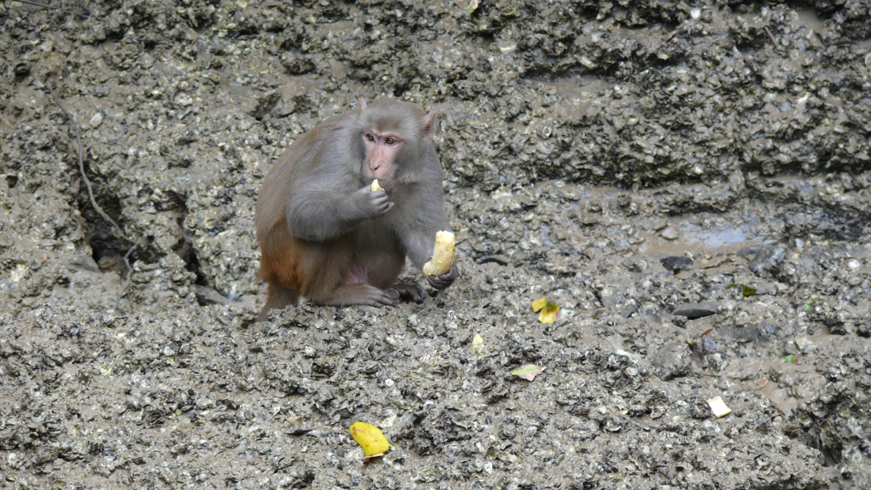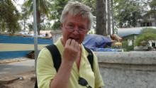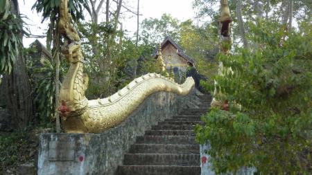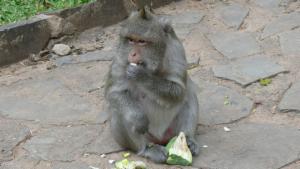Letzte Station der heutigen Besichtigungstour ist der Wat Phnom (Tempel auf dem Berg), wohl das wichtigste lokale Heiligtum in Phnom Penh. Hier wird auch die Stifterin der Pagode und Namensgeberin der Stadt, Frau Penh, verehrt. Leider sind die Bauten wegen Bauarbeiten gesperrt, und so bleiben die vielen Affen, die den Hügel bevölkern, die Hauptattraktion. Sie lassen sich gern füttern und fotografieren, aber wenn man ihnen zu nahe kommt, greifen sie auch an. Ulrich muss diese Erfahrung machen, glücklicherweise wird er nicht gebissen.