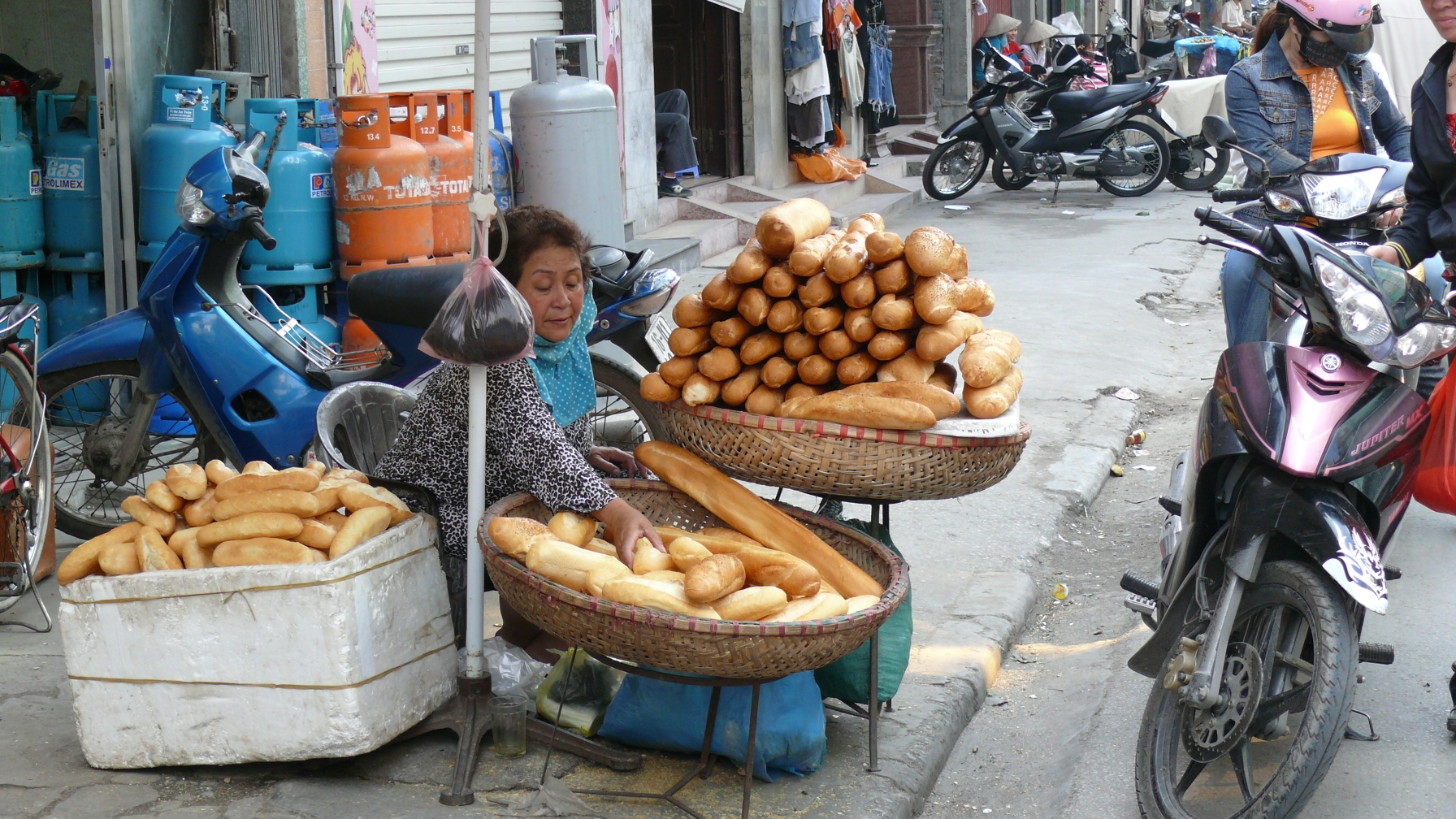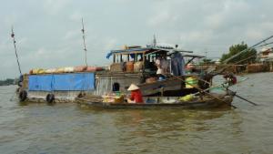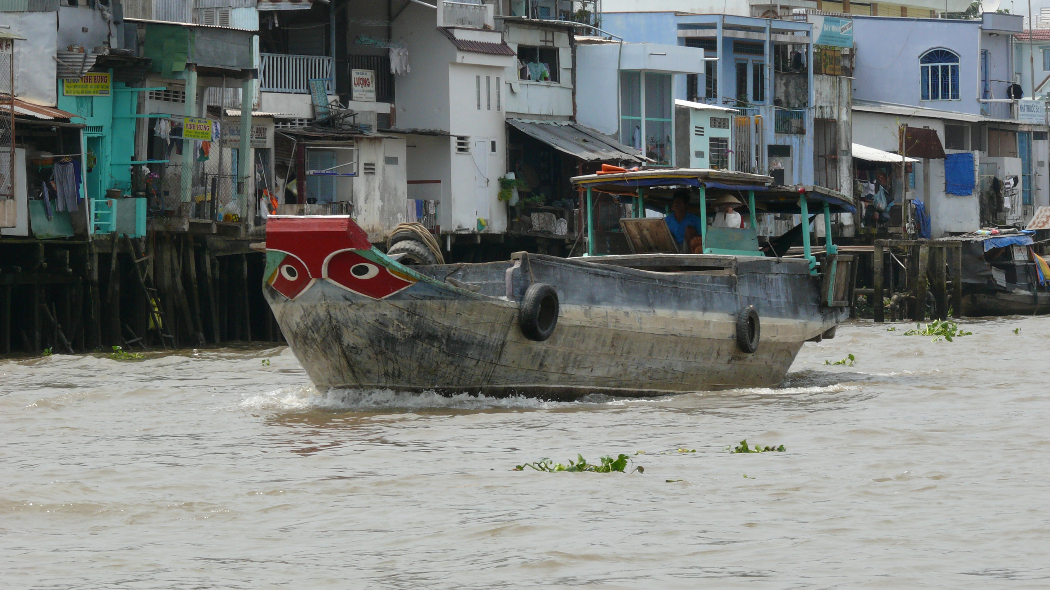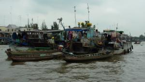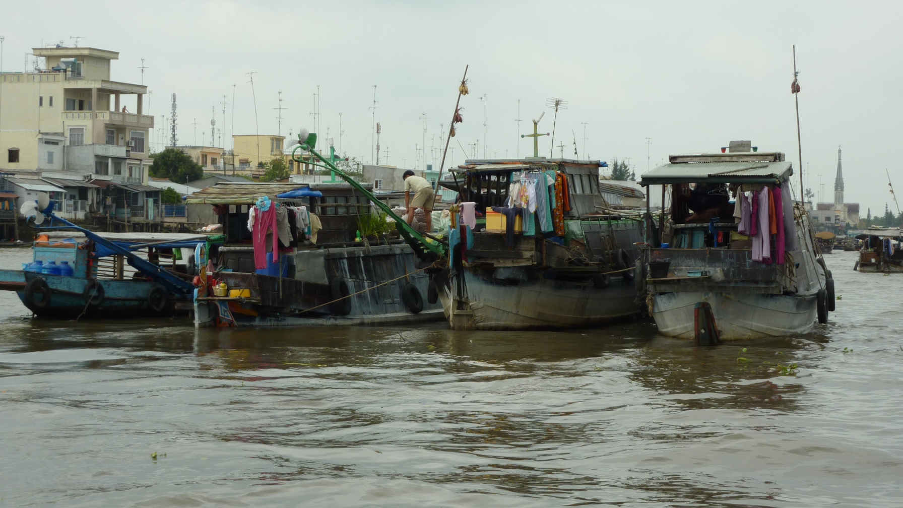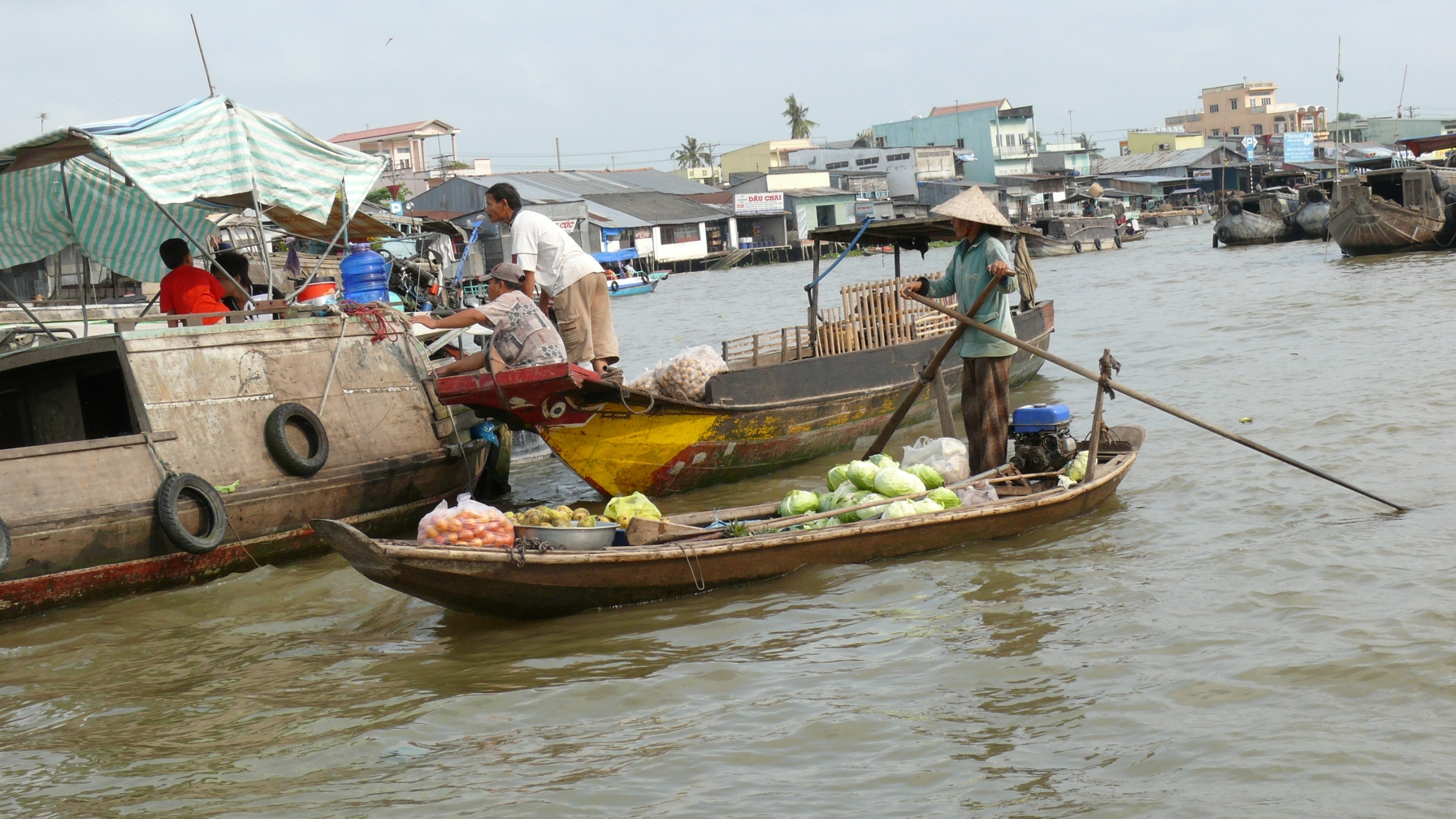 Gemächlich schippern wir über einen schwimmenden Markt. Die Verkaufsboote liegen hier in Reihen nebeneinander, sie haben am Bug lange Stangen, an denen die Waren (oder ein Symbol dafür) befestigt sind, die man hier kaufen kann. Es gibt nicht nur Boote mit Obst und Gemüse, sondern auch welche mit fertigen Gerichten oder Getränken. So kann man sich im Kaffeeboot seinen Kaffee kaufen, und im Nudelsuppenboot bekommt man die berühmte Phò, die vietnamesische Nudelsuppe, die hier zu jeder Tageszeit gegessen wird. Zum Einkaufen braucht man selbstverständlich auch ein Boot.