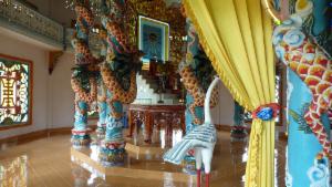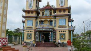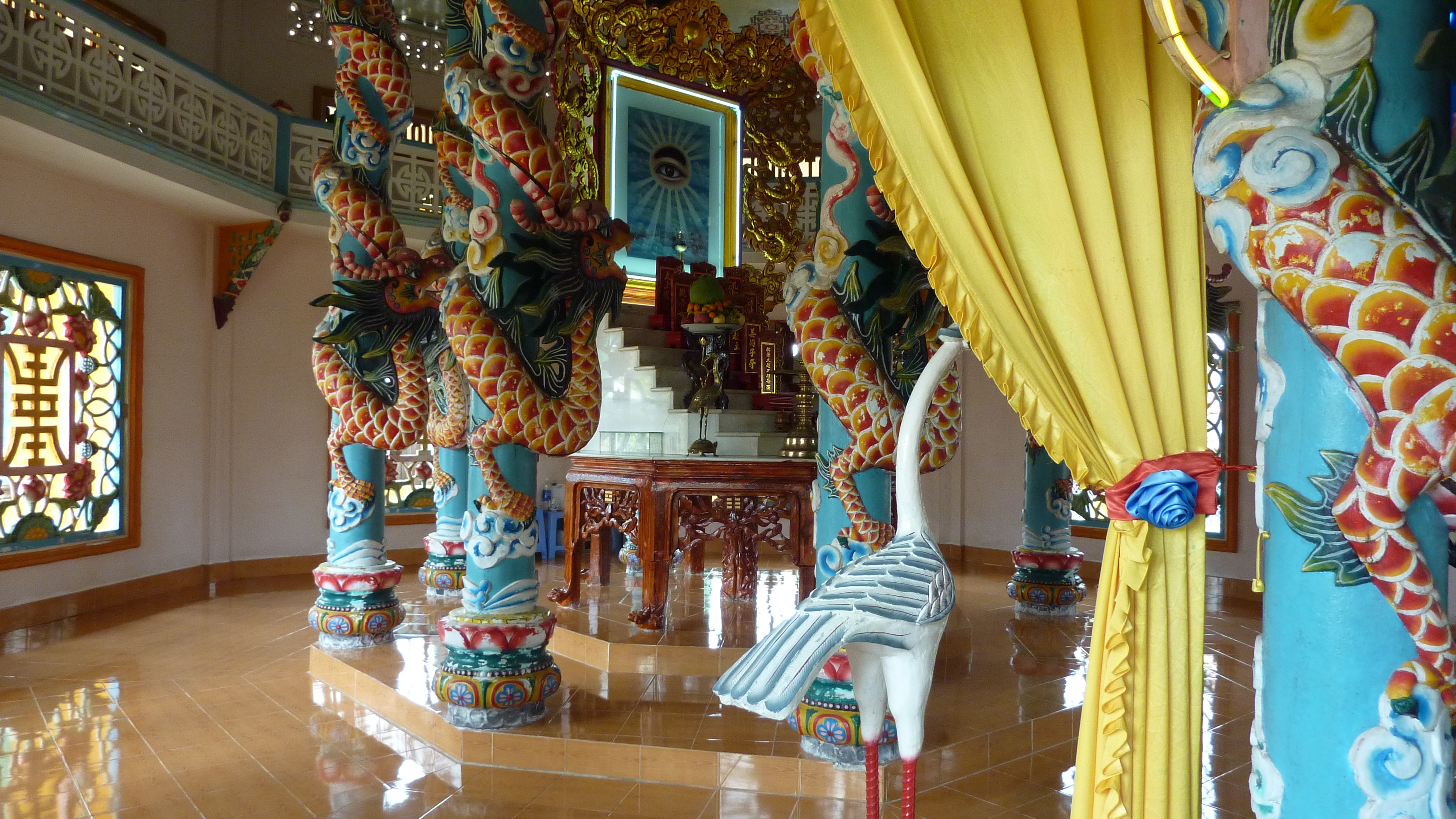In Caî Lay besichtigen wir einen Cao Dai Tempel. Diese religiöse Gruppe gibt es erst seit 1926. Ihr Gründer ist Ngo Minh Chieu, dem der Geist Cao Dai in einer spiritistischen Sitzung erschienen war. Die Sekte sieht sich nach Moses und den Gründern der Weltreligionen als dritte und letzte Manifestation des Absoluten. Unter dem göttlichen Auge des Cao Dai sind alle Religionen vereint. Die Tempel der Sekte sind wahre Farbenexplosionen und vollgestopft mit prunkvollem Kitsch.
