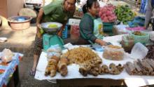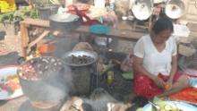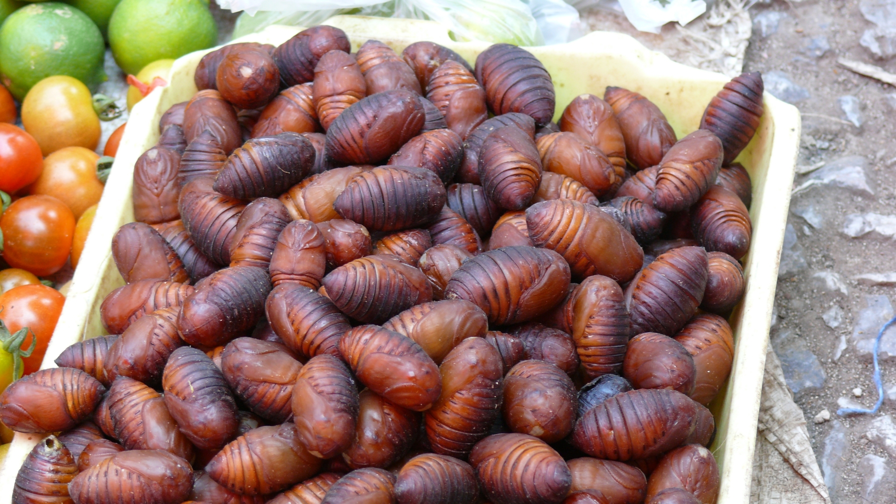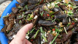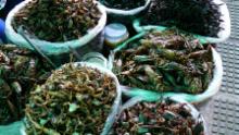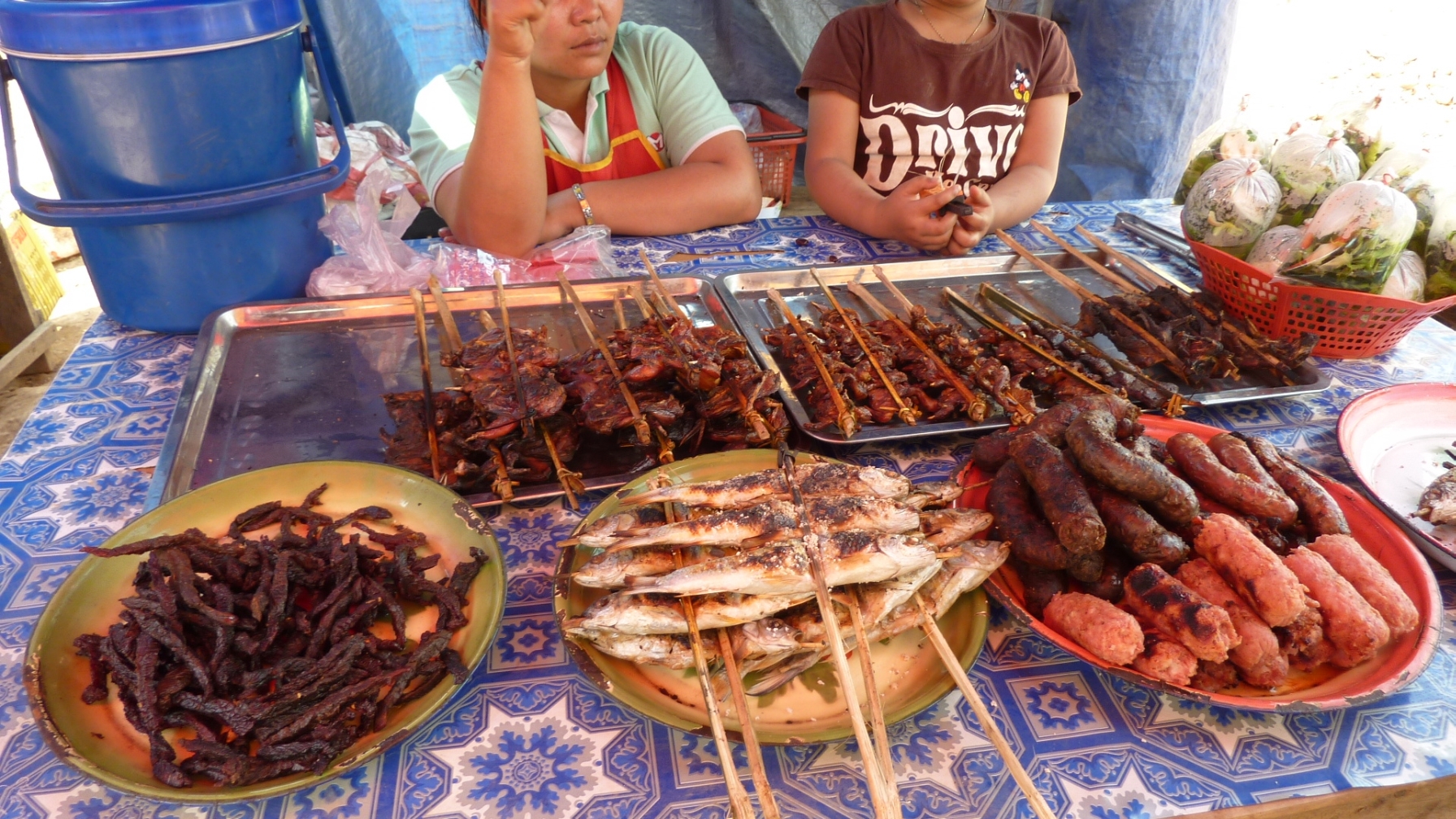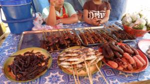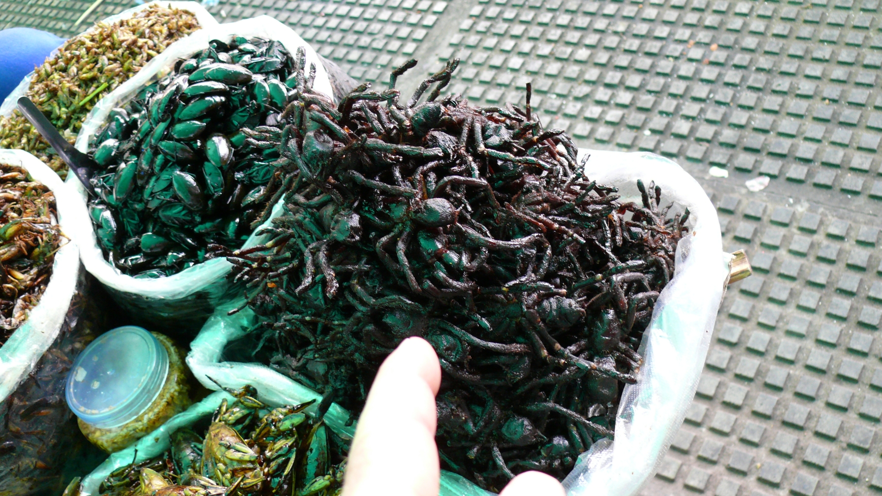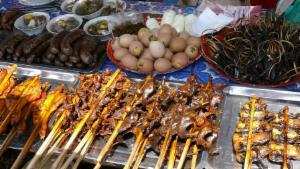 ... und auf dem Rückweg aus diesem Park haben wir dann unser ultimatives kulinarisches Erlebnis: Vor einem Stand mit verschiedenen gegrillten Käfern lassen wir uns soweit auf ein Gespräch mit einem Einheimischen ein, dass wir nicht mehr ablehnen können, als er uns welche zum Probieren anbietet. Wir haben es überlebt, und nüchtern betrachtet haben sie nicht einmal schlecht geschmeckt.