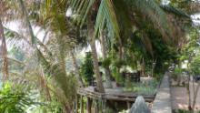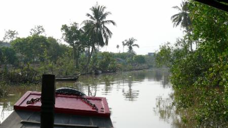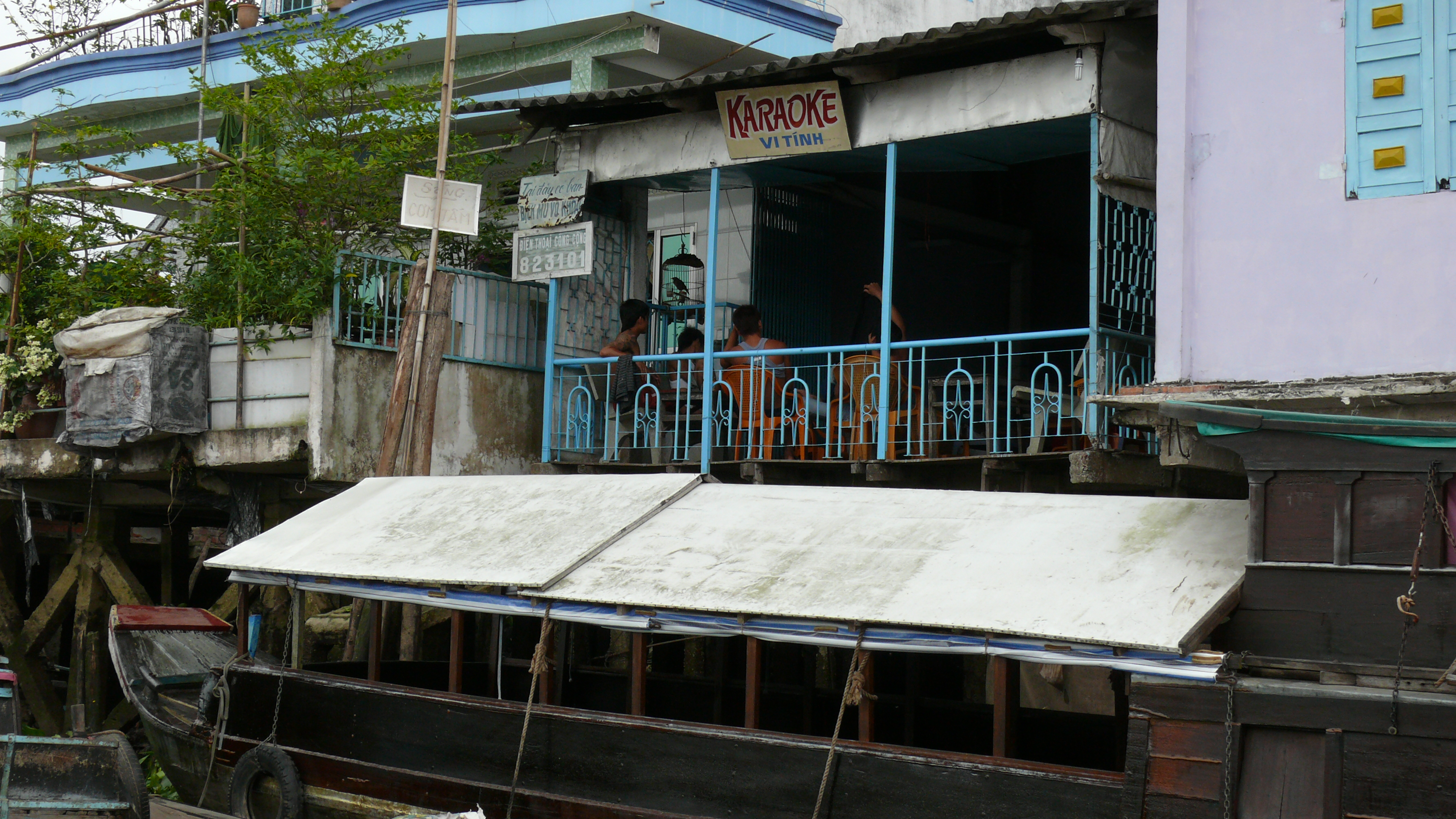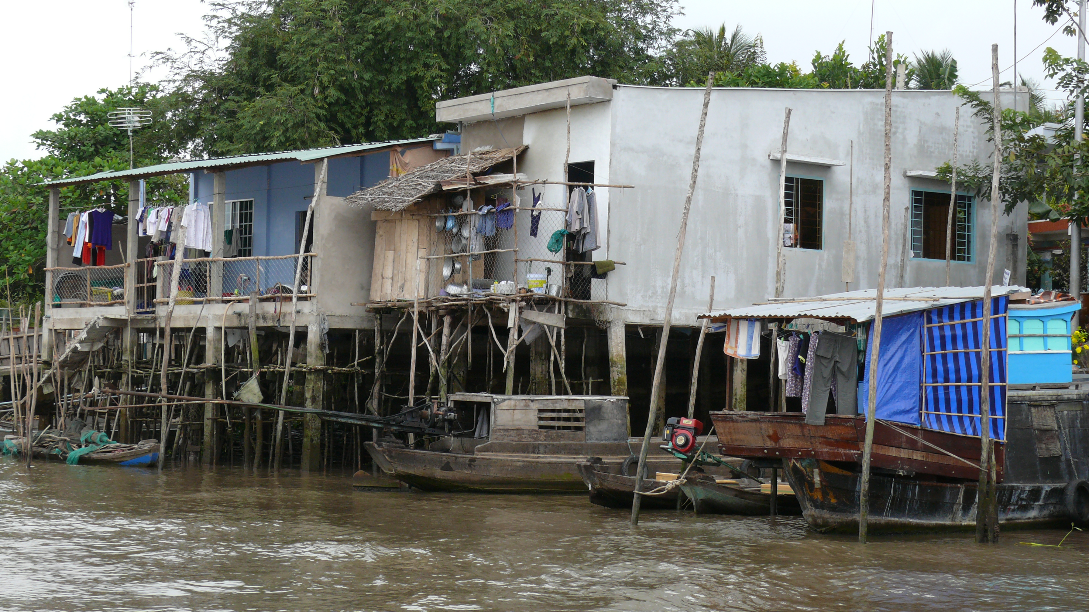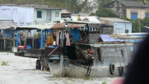 Am späten Vormittag sind wir in Cái Bè. Hier steigen wir auf ein Boot um, das uns durch einige der zahlreichen Wasserarme des unteren Mekongdeltas fährt. Ganz nah kommen wir an den Wohnhütten vorbei, die auf Pfählen im Wasser stehen. Es sind Holzplattformen mit ein paar Wänden, Fenster gibt es nicht. Manche haben allerdings Elektrizität, so dass ein Fernseher betrieben werden kann. Der bildet oftmals zusammen mit einer Hängematte und dem unvermeidlichen Moped die einzigen Einrichtungsgegenstände. Das eigentliche Leben spielt sich draußen ab, hier ist auch normalerweise die Kochstelle. Viele Familien dort leben aber auch ausschließlich auf ihren Booten.