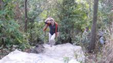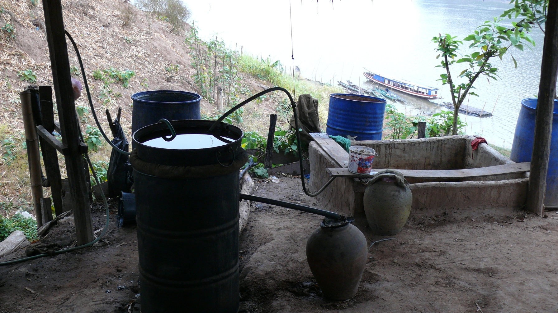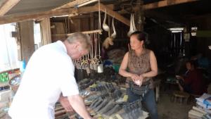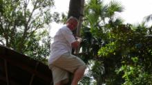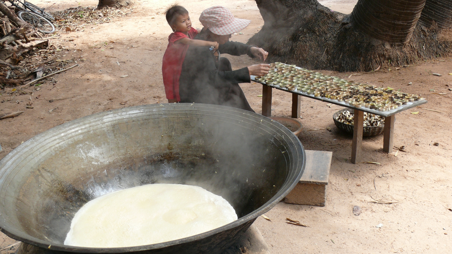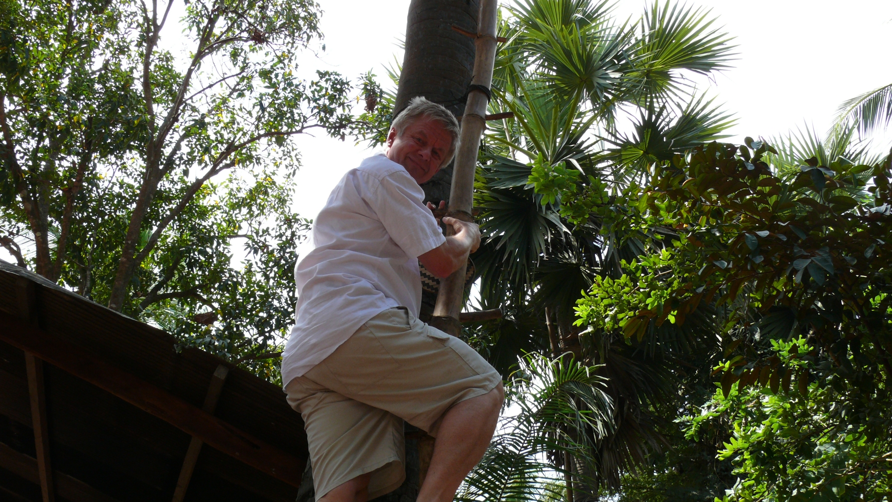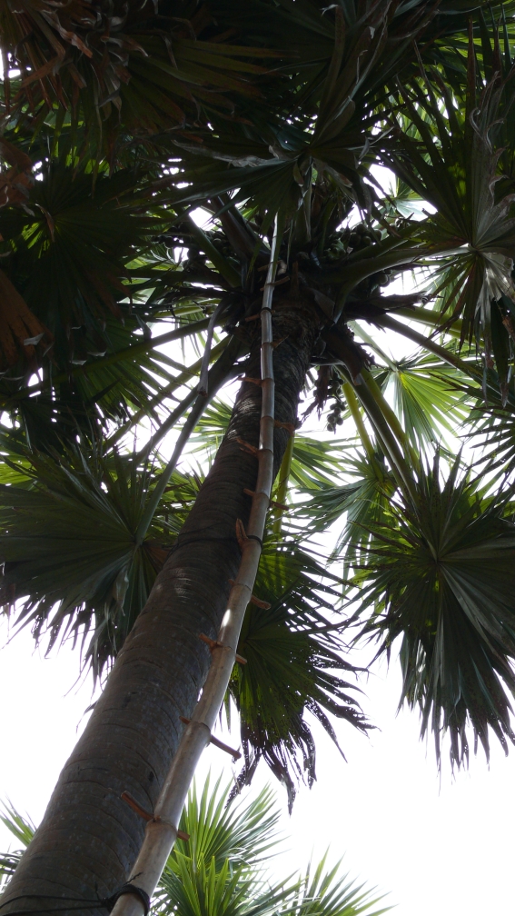 In dieser Gegend wird Palmzucker hergestellt. Wir halten an in einem Dorf und schauen uns den Fertigungsprozess an. Zur Gewinnung des zuckerhaltigen Pflanzensaftes muss man hoch in die Palmen klettern. Die Leitern entsprechen nicht gerade deutschen Sicherheitsstandards, und Ulrich traut sich auch nur ein relativ kleines Stück hinauf.