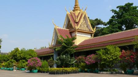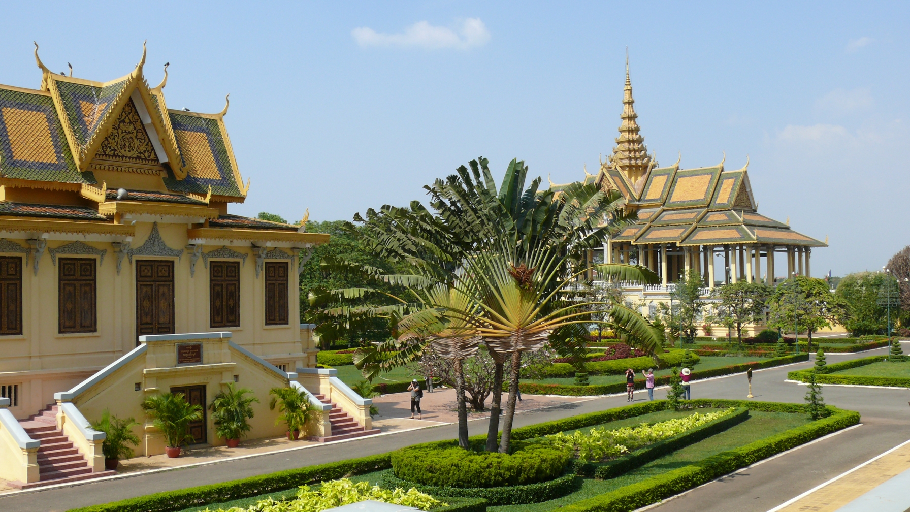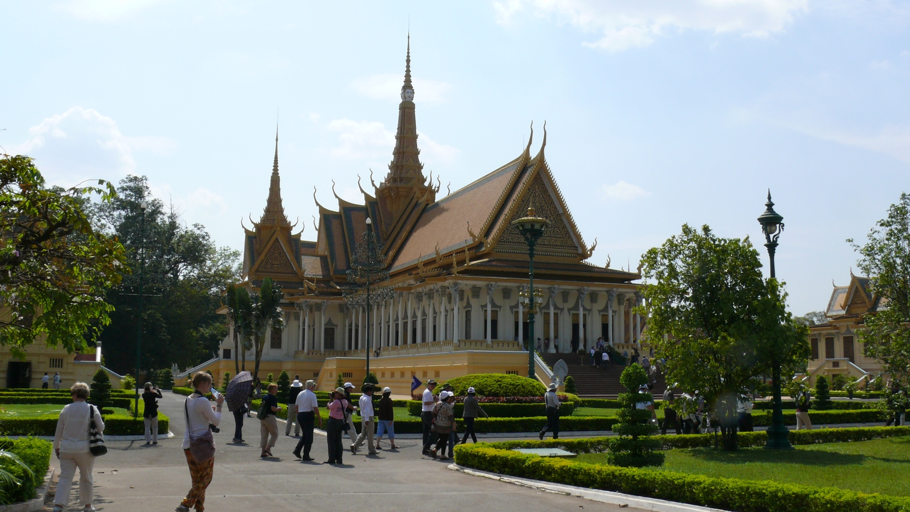 Die Besichtigungstour am Nachmittag beginnt am Königspalast. Hier fließen Tonle Sap und Mekong zusammen, und schon König Ang Chan II. hatte hier im 19. Jahrhundert eine Zitadelle gebaut. Einige Jahrzehnte später ließ Norodom I. eine Palastanlage aus Holz errichten, und Anfang des 20. Jahrhunderts dann unter König Sisowath wurde diese Anlage mit französischer Hilfe durch einen Steinbau ersetzt. Der Palast ist immer noch Sitz der kambodschanischen Königsfamilie, die allerdings keinen direkten politischen Einfluss mehr hat, Kambodscha ist offiziell eine konstitutionelle Monarchie. Zurzeit residiert hier Norodam Sihanouk, ein Sohn des berühmten Königs Sihanouk, der von 1941 bis 2004 Staatoberhaupt von Kambodscha war, und der seitdem im Ausland lebt.
