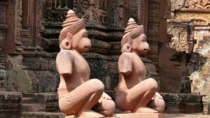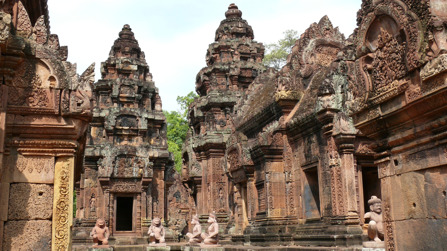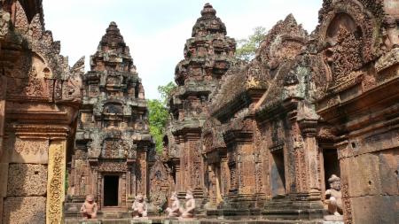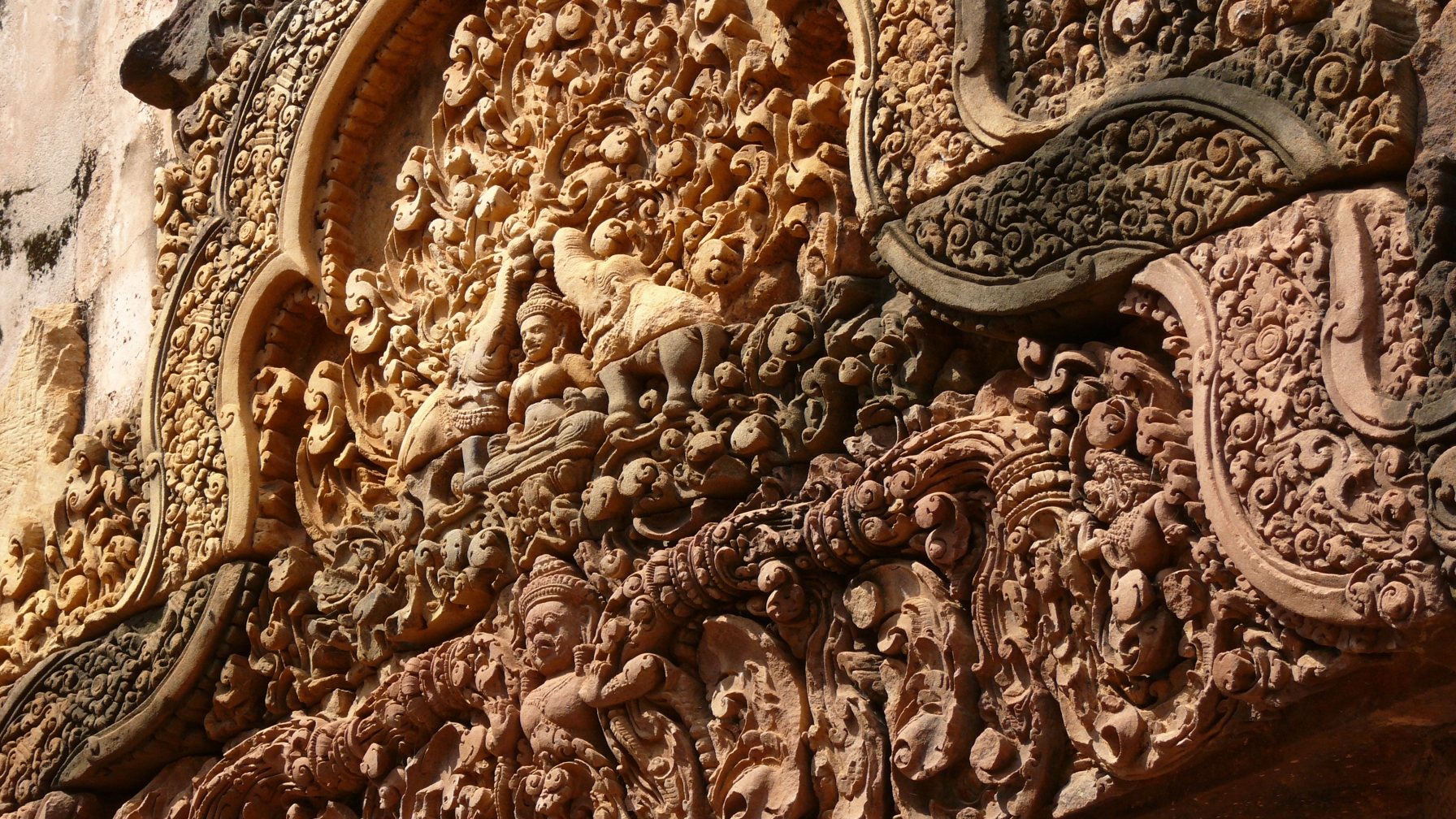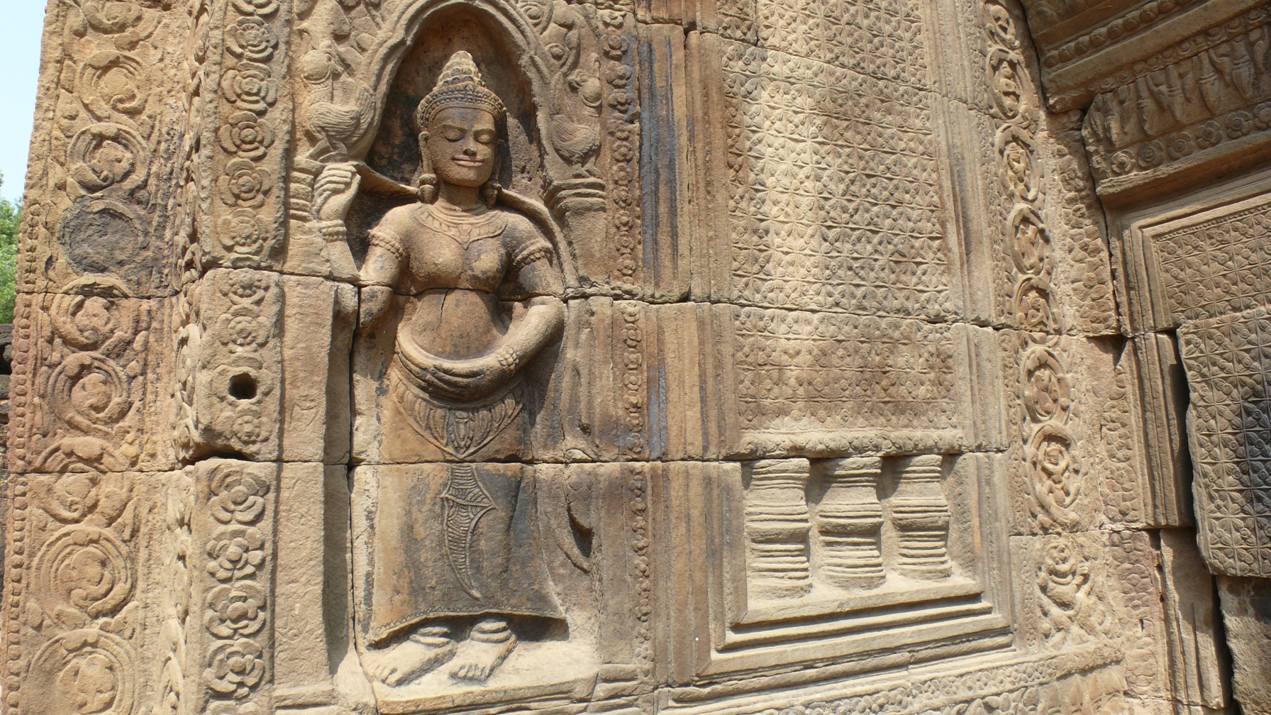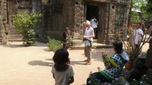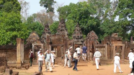 Heute stehen die letzten Tempelbesuche in Angkor auf dem Programm. Wir fahren nach Banteay Srei, dem kleinsten Tempel in diesem Areal. Er wurde im 10. Jahrhundert erbaut und gilt als ein Juwel unter den Khmer Heiligtümern. Der Name "Zitadelle der Frauen" deutet möglicherweise auf seine filigrane Gestaltung hin. Tatsächlich wirkt die reiche Ornamentik fast wie aus Holz geschnitzt. Allerdings ist es hier sehr voll, so dass es kaum möglich ist, die Eindrücke in Ruhe auf sich wirken zu lassen. Zudem scheint es auch noch heißer zu sein als in den letzten Tagen.