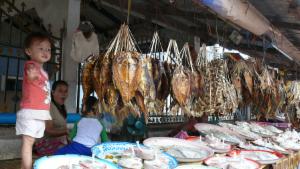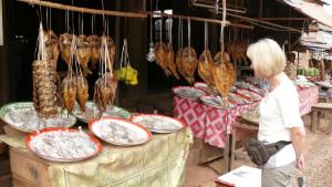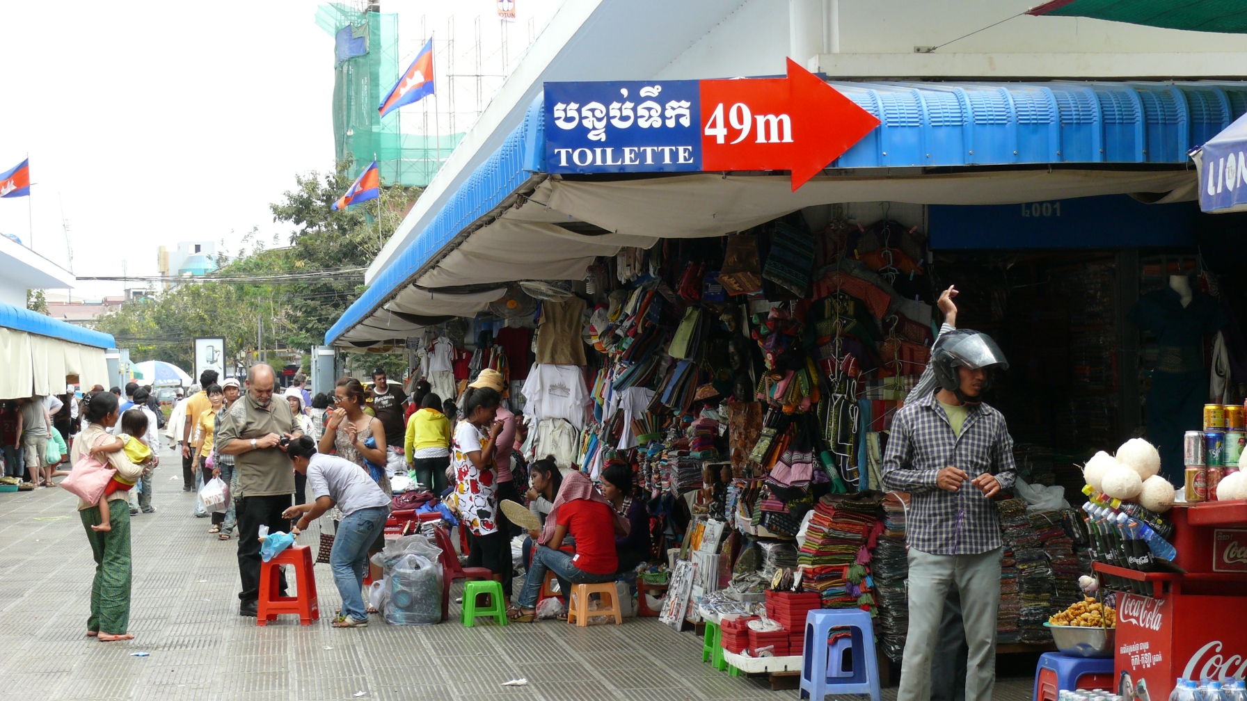 .Zurück in Phnom Penh besuchen wir noch den Zentralmarkt, der sich ein wenig vom Chaos der Märkte abhebt, die wir bisher gesehen haben. Er befindet sich in einer großen Halle; von einem zentralen Platz gehen mehrere Gänge mit unterschiedlichsten Verkaufsständen ab. Neben allen Waren für den täglichen Gebrauch gibt es auch gegrillte Spinnen und Kakerlaken. Wir erstehen zwei Schirme, die uns bei den Besichtigungen gegen die Sonne schützen sollen, Hüte sind bei den Temperaturen ja nicht immer nur angenehm. Ob dieser Einkauf fast am Ende der Reise noch wirklich Sinn macht, sei dahin gestellt.