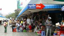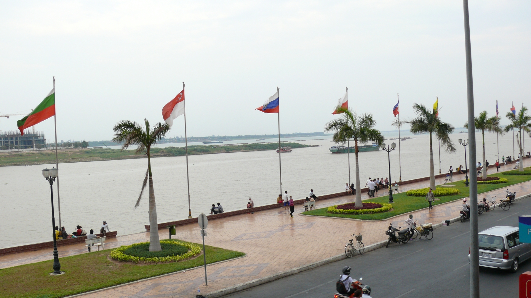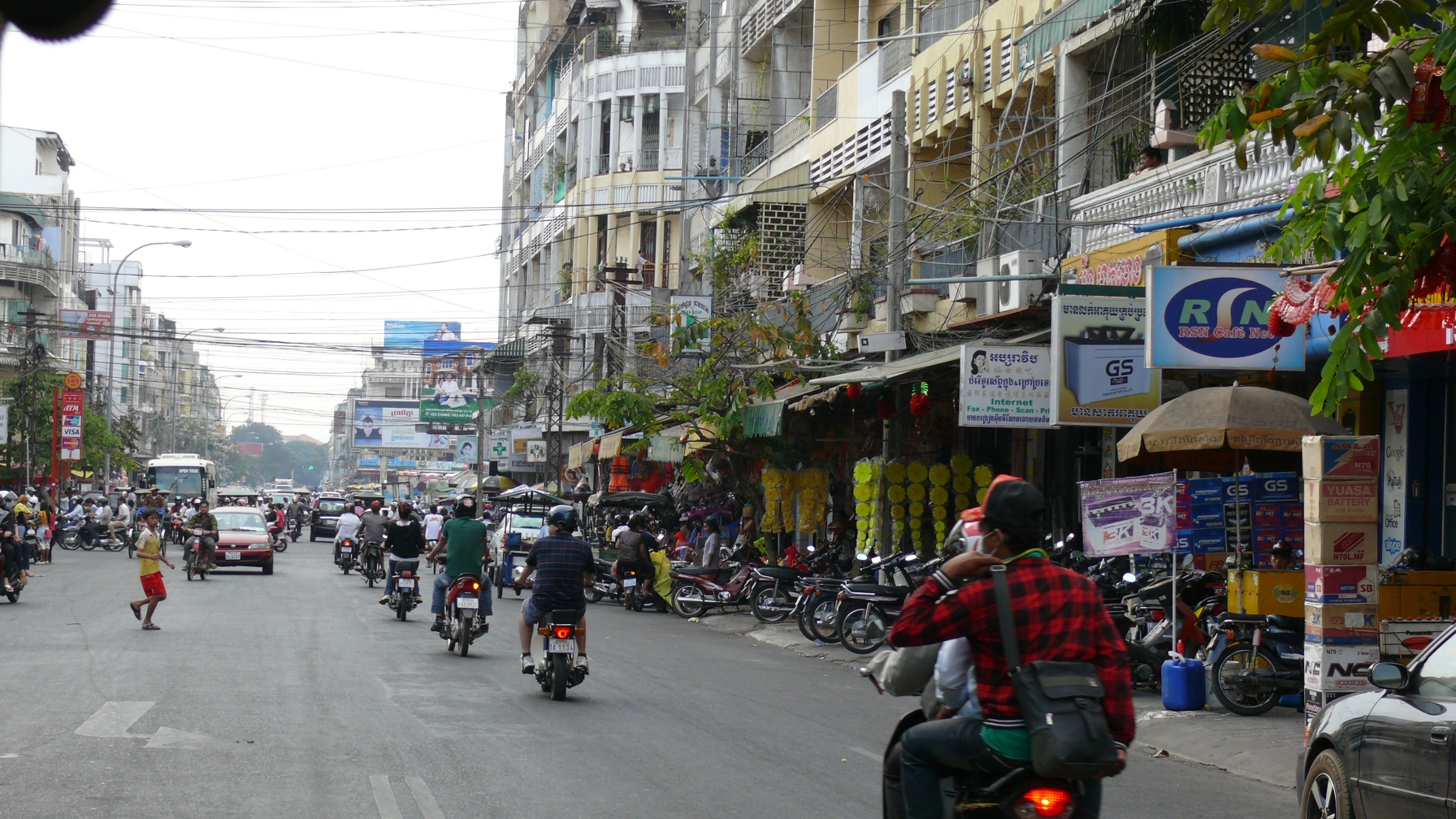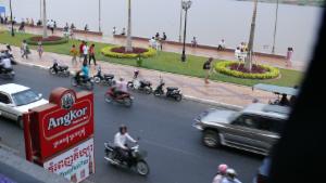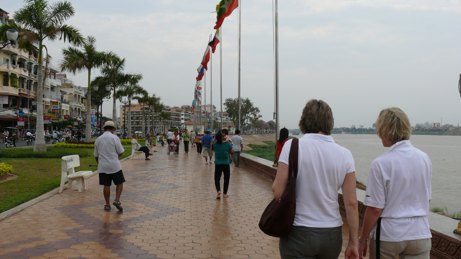 Auf den Fahrten durch die Stadt konnten wir einen Eindruck von Phnom Penh gewinnen. Die Stadt, die noch in 1960’er Jahren eine “blühende Märchenstadt” war, wurde im April 1975 innerhalb von 48 Stunden von den Roten Khmer total geräumt. Ausnahmen gab es nicht, selbst Krankenhäuser wurden evakuiert. Wer sich weigerte, wurde hingerichtet. 1979, nach der Vertreibung der Roten Khmer, lag Phnom Penh in Schutt und Asche. Mit UN-Hilfe wurde die Stadt langsam wieder aufgebaut. Heute ist Phnom Penh eine Stadt voller Gegensätze und Widersprüche. Es gibt großstädtisch prachtvolle Boulevards und liebevoll restaurierte Kolonialbauten, man sieht teure Autos und mondäne Geschäfte. Aber vor den Prunkbauten stehen bettelnde Kinder, und man sieht viele Menschen, die offenbar auf der Straße leben. Die wohlhabenderen Familien leben in eigenen Stadtvierteln, ihre Grundstücke sind mit hohen Mauern und Stacheldraht gesichert.