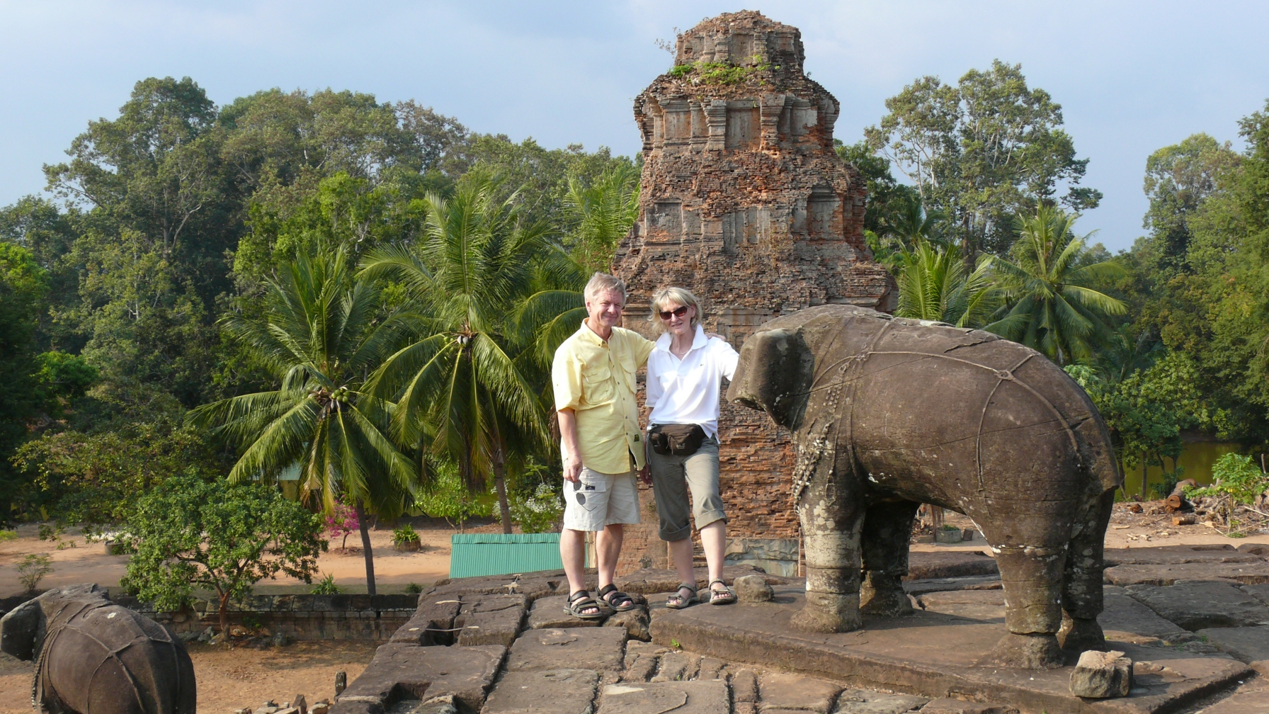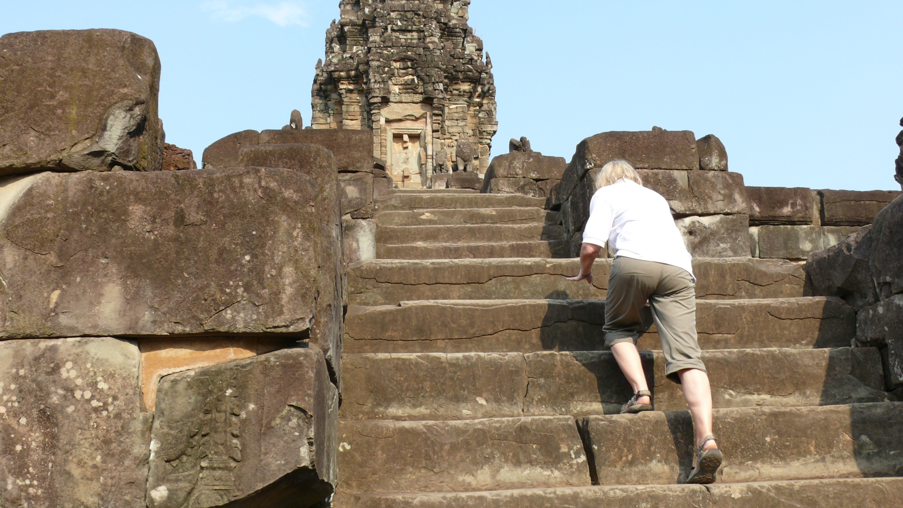 Nach dem Essen fahren wir zum Lolei, zum Preah Ko und zum Bakong. Diese Tempel der Roulos Gruppe, ca. 13 km südöstlich von Siem Reap, vermitteln uns schon einen Eindruck von dem, was uns hier erwartet. Wir tauchen ein in die Khmer-Architektur und bewundern die vielen schönen Details. Wo immer es geht, steigen wir nach oben, um die Chance zu haben, die Gesamtanlage auf uns wirken zu lassen. Die Bauwerke strahlen eine mystische Fremdheit aus, lassen aber auch eine große Anziehungskraft spüren, und sie machen uns ehrfürchtig. Diese Gefühle werden wir auch in den nächsten Tagen trotz der Touristenscharen immer wieder erleben.