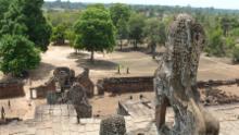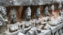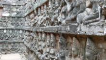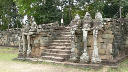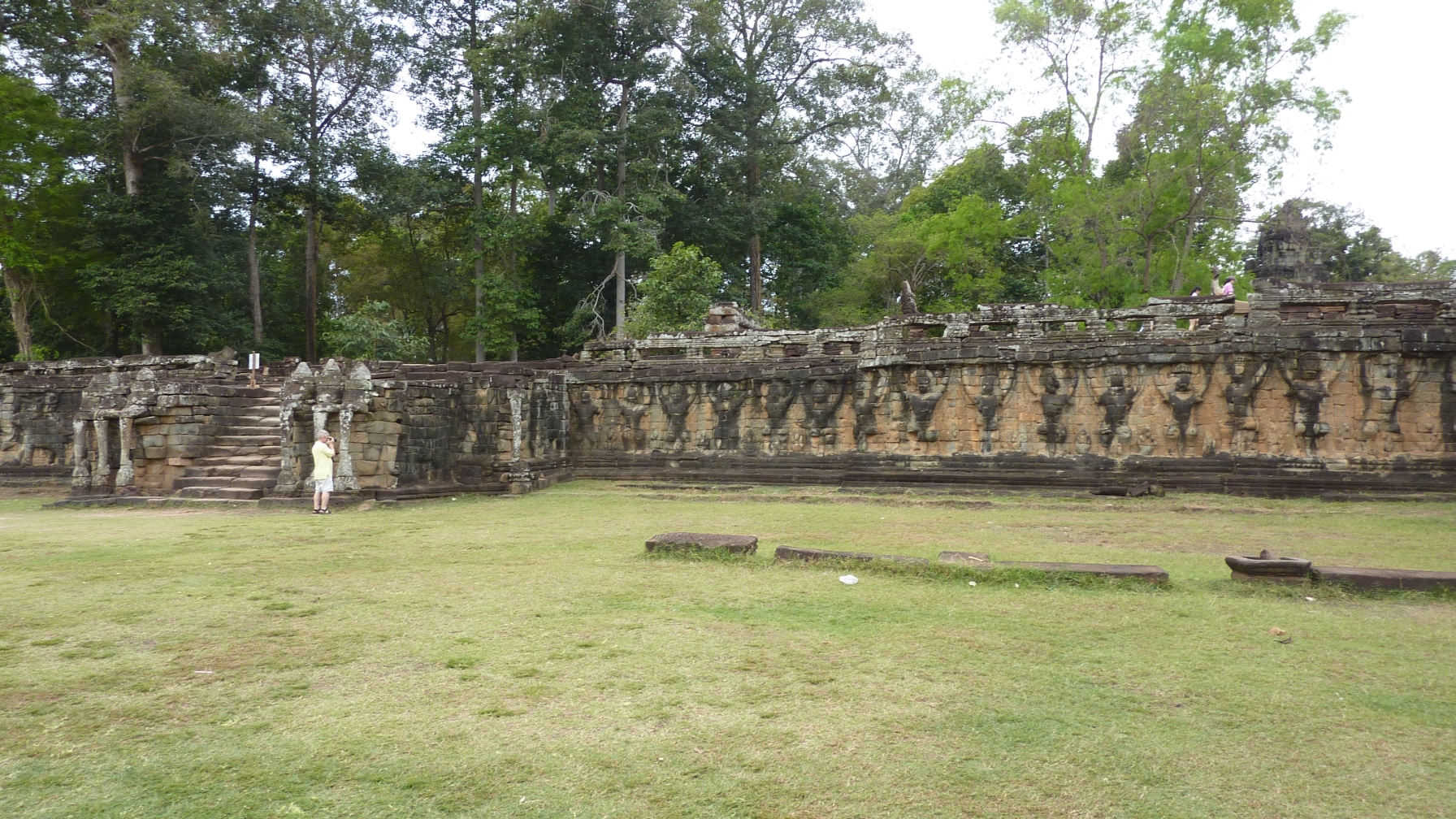Das nächste Ziel ist Angkor Thom, das 250 Jahre lang die Hauptstadt des Khmer-Reiches war, und hier zunächst der Königspalast, bzw. seine Reste. Von den riesigen Palastanlagen sind nur noch die Terrassen erhalten, auf denen die Holzgebäude standen. Ihre Dimensionen jedoch lassen auf die Größe des einstigen Palastes schließen. Allein die sogenannte Elefantenterrasse auf der Ostseite ist 300 m lang. Von hier nahm der König Paraden ab, oder er beobachtete Pferderennen und Polospiele, die hier stattfanden. Nach Khmer-Art ist das gesamte Mauerwerk mit aufwändigen Reliefs geschmückt.