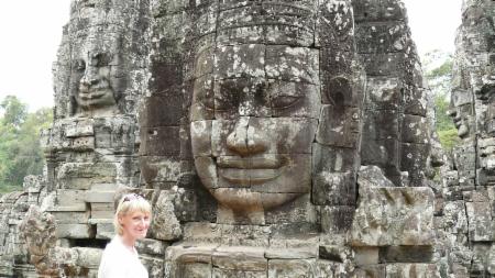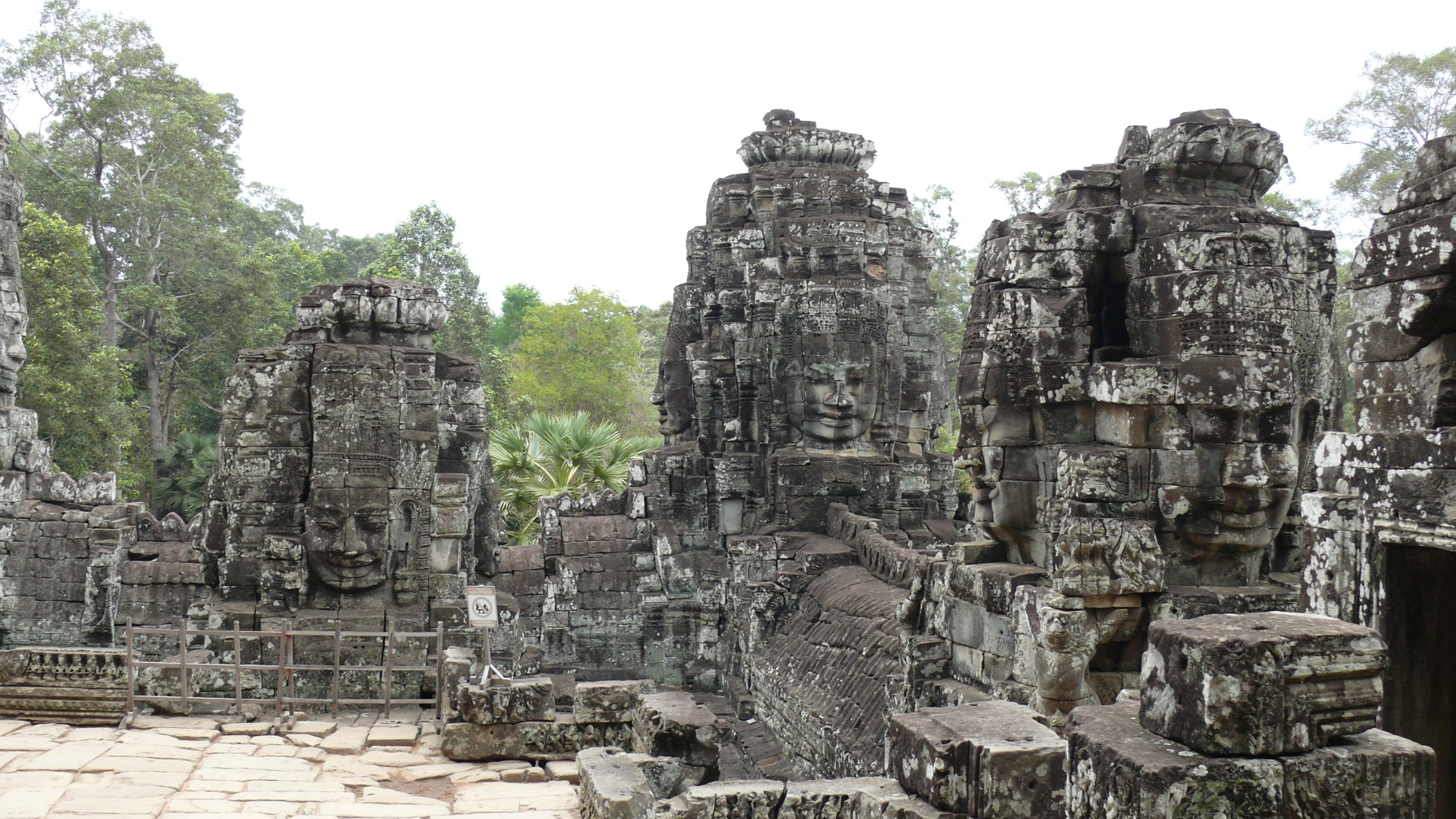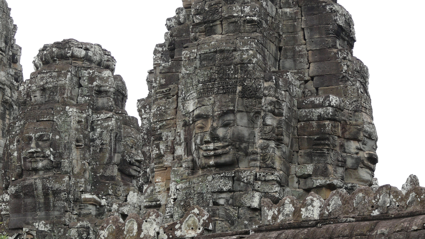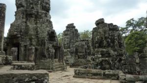 Genau im Zentrum von Angkor Thom liegt der Bayon. Er gehört zu den mysteriösesten und zugleich faszinierendsten Heiligtümern weltweit. Er besteht aus vielen verschachtelten Kammern und Gängen, und er beheimatet die rätselhaften riesigen Gesichtertürme mit den meterhohen lächelnden Gesichtern des Bodhisattva Lokeshvara, der damit seine beschützende Macht in alle vier Himmelsrichtungen des Reiches ausstrahlen sollte. Ursprünglich gab es etwa 50 dieser Türme, von denen heute nur noch 37, zum Teil wiedererrichtete, stehen. Auf den meisten Türmen sind vier Gesichter zu sehen, die nach den vier Haupthimmelsrichtungen ausgerichtet sind, während manche nur zwei oder drei tragen.