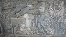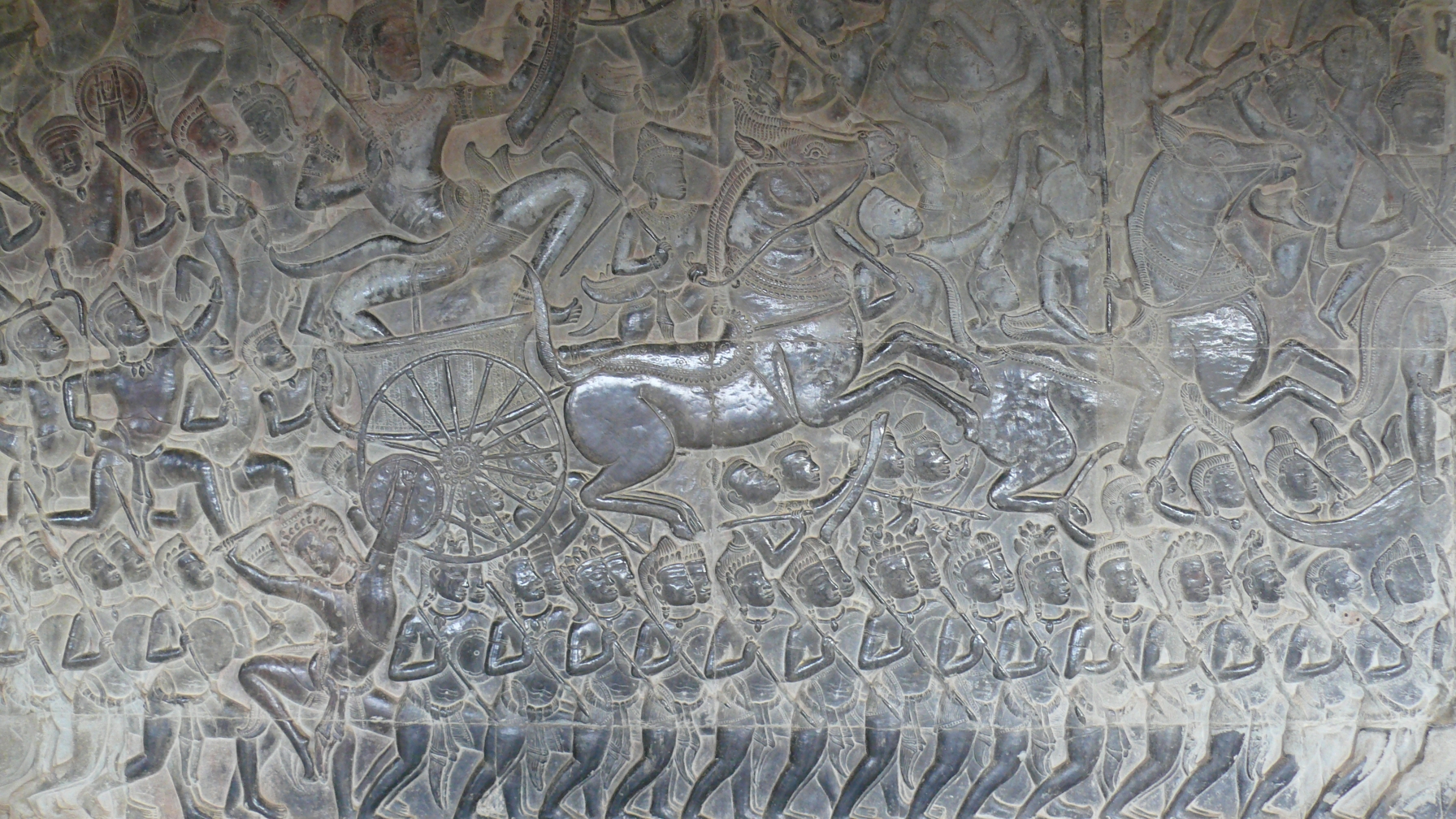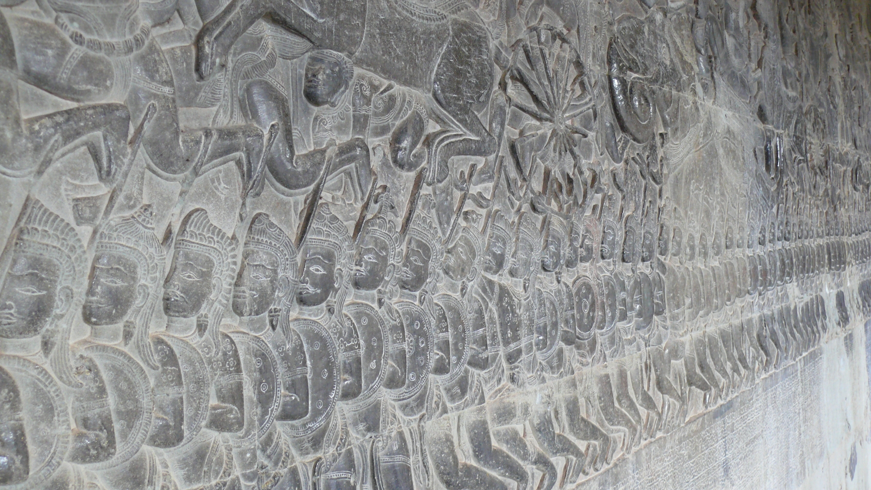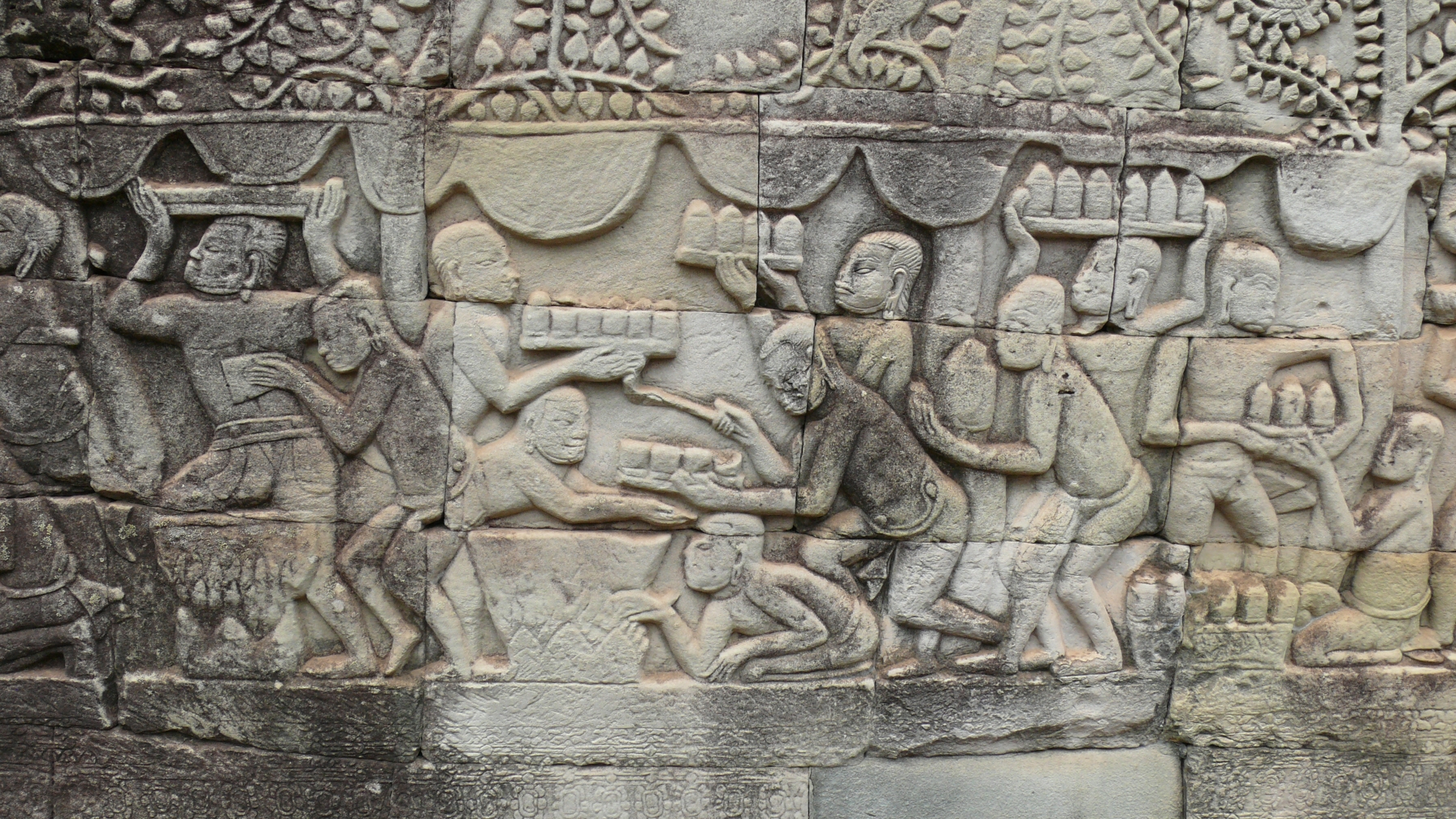 Auch die Galerien des Bayon sind mit zahllosen Reliefs geschmückt, die – wenn man sie zu lesen versteht – unendlich viele Geschichten aus dem Leben der Khmer erzählen, sowohl ganz Profanes, als auch die politischen Ereignisse. Ohne die Erklärungen unseres Guides hätten wir jedoch das meiste gar nicht wahrgenommen.