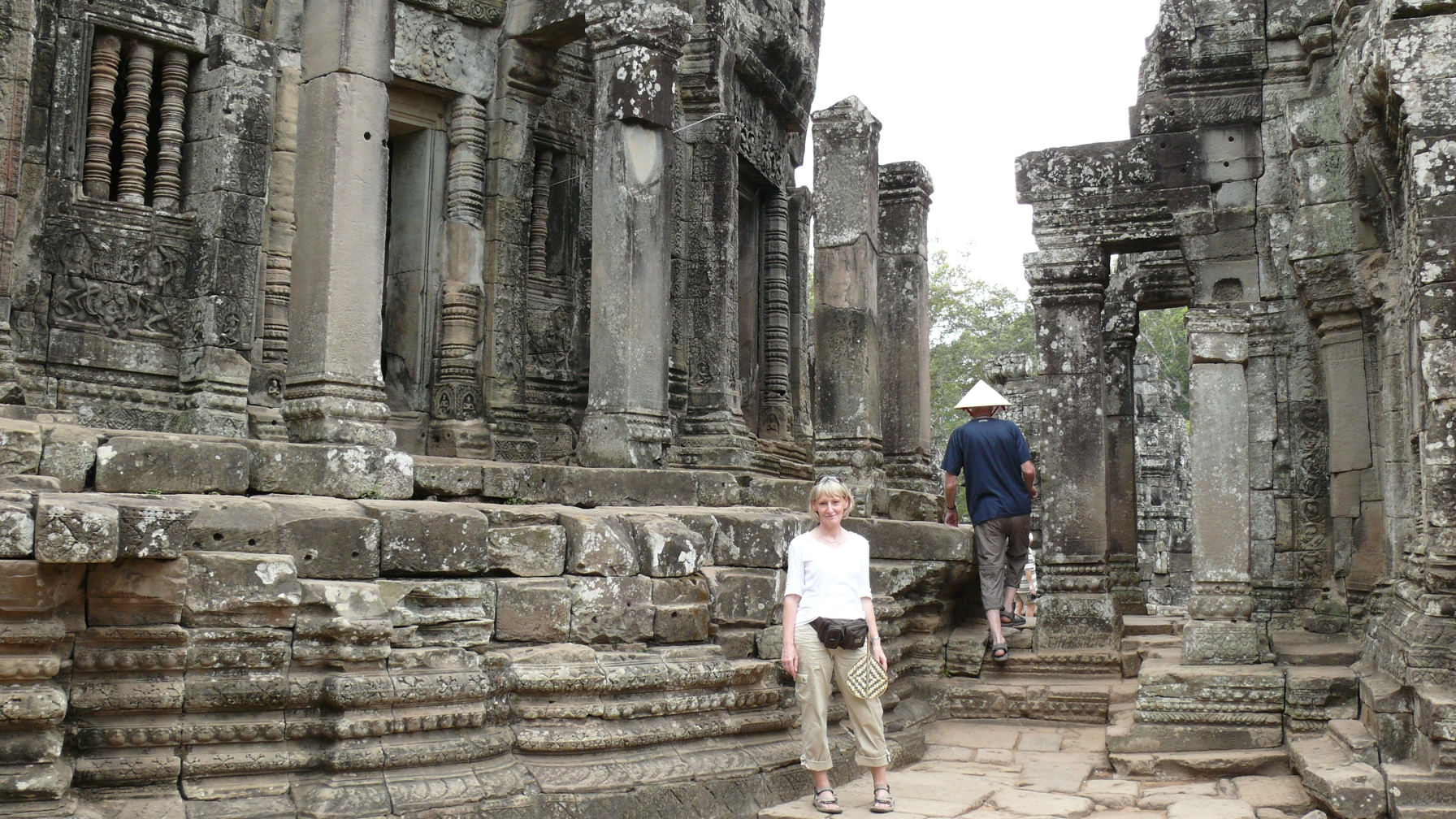 Erster Anfahrtspunkt ist Ta Prohm, der Überwachsene, sicherlich einer der spektakulärsten Tempel von Angkor, ganz besonders, weil man ihn so belassen hat, wie man ihn entdeckt hat – zu großen Teilen vom Urwald überwachsen. So begreift man, was in den letzten Jahrhunderten hier mit den Bauwerken passiert ist. Die Bilder, wie sich malerisch die Wurzeln von Thitpokbaum und Würgefeige über die Mauern ziehen, sind in der ganzen Welt bekannt, und auch uns ziehen diese Eindrücke sofort in ihren Bann. Wir machen unzählige Fotos, weil ein Motiv schöner ist als das andere. Ta Prohm wurde im 12. Jahrhundert erbaut und war ein buddhistisches Kloster. Kaum zu glauben, dass hier einmal mehr als 12.000 Menschen gelebt haben.