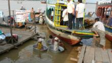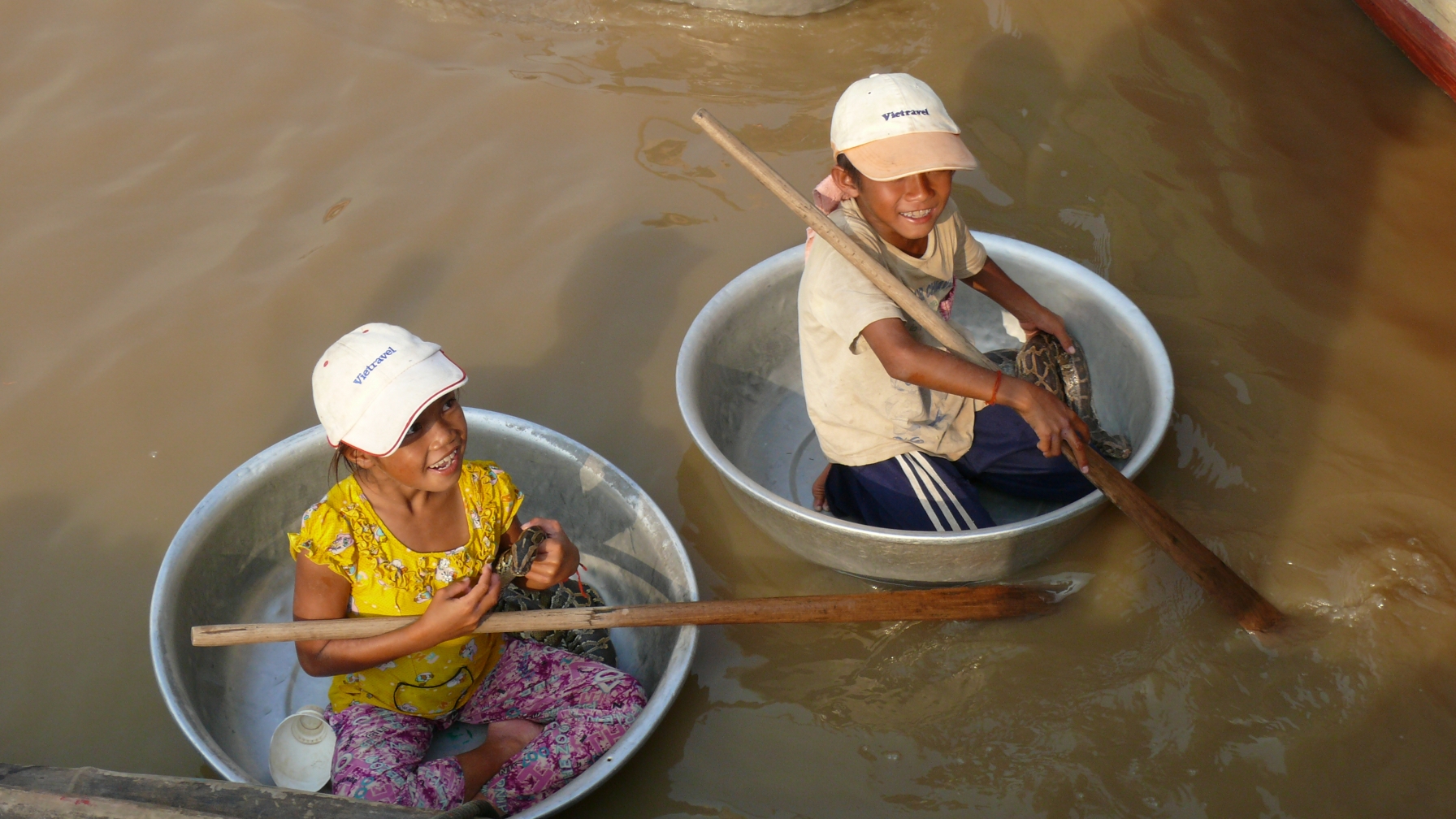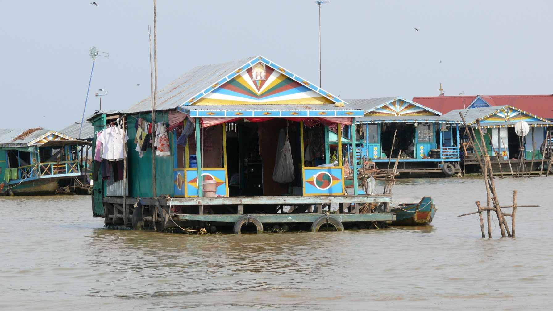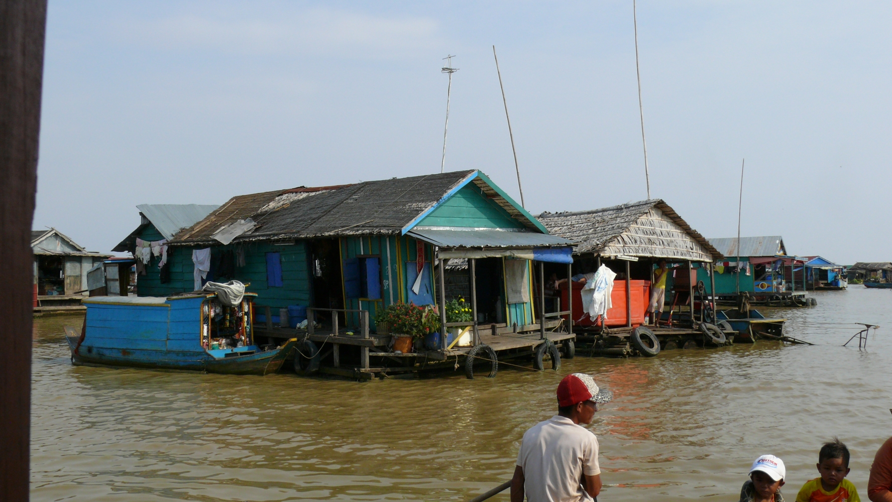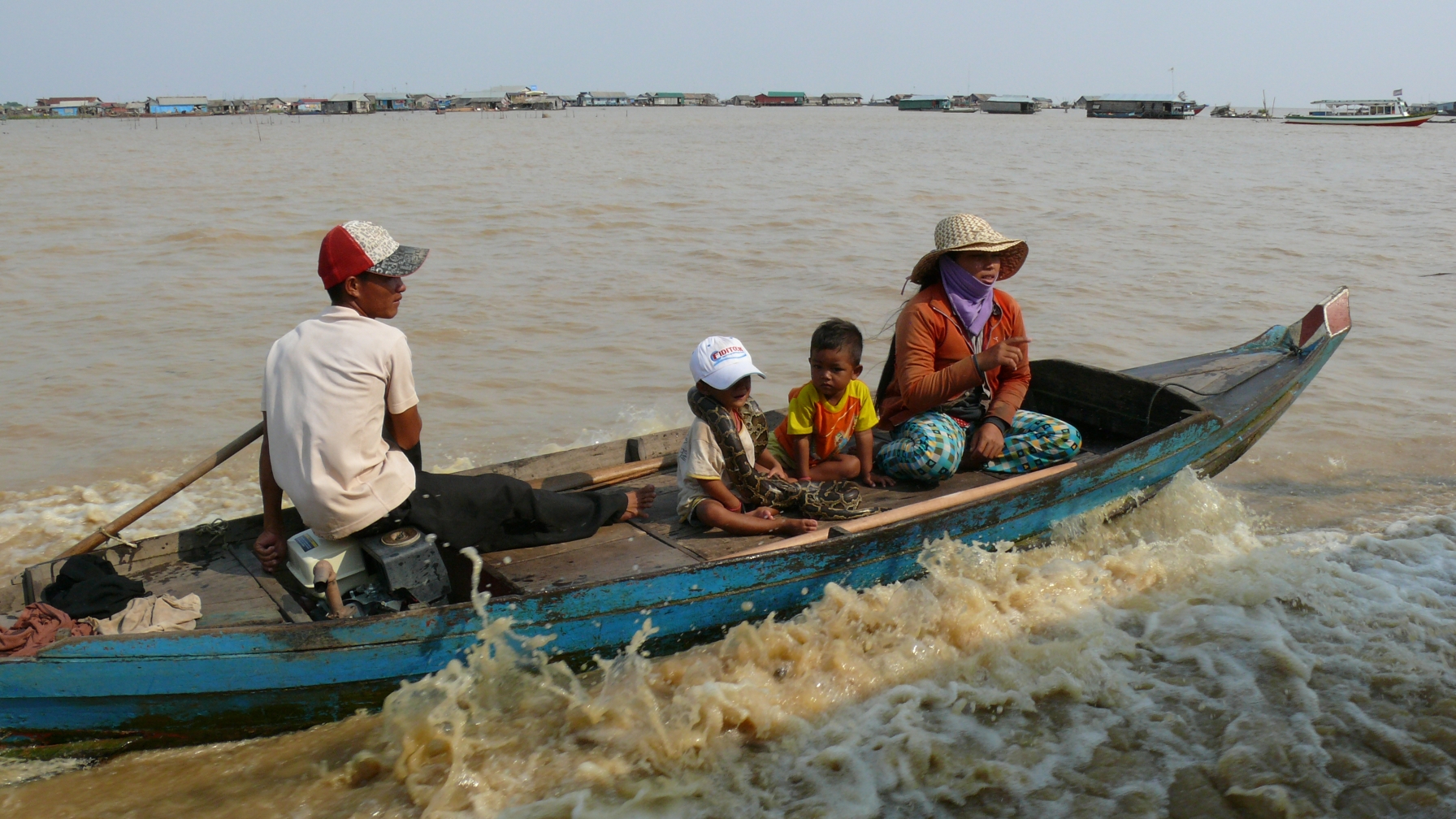 Nachmittags fahren wir zum Tonle Sap, dem größten See in Südostasien. Der Tonle Sap fungiert als Auffangbecken für die Wassermassen des Mekong, mit dem er durch den Tonle-Sap-Fluss verbunden ist. Dieser ändert (einzigartig in Asien) zweimal im Jahr seine Fließrichtung, je nachdem, ob der Mekong Hochwasser führt oder nicht. Der Tonle Sap See ist zum Höhepunkt der Monsunregenzeit ca. 10.000 km² groß, das entspricht etwa der Hälfte der Fläche von Sachsen-Anhalt. Am Ende der Trockenzeit nimmt er nur noch eine Fläche von 2.500 km² ein. Ohne den See als Wasser- und Nahrungslieferant hätte das Angkor-Reich mit Sicherheit nicht solche Größe erreichen können. Wegen seiner reichhaltigen Flora und Fauna wurden der See und sein Einzugsgebiet 1997 von der UNESCO zum Biossphärenreservat erklärt.