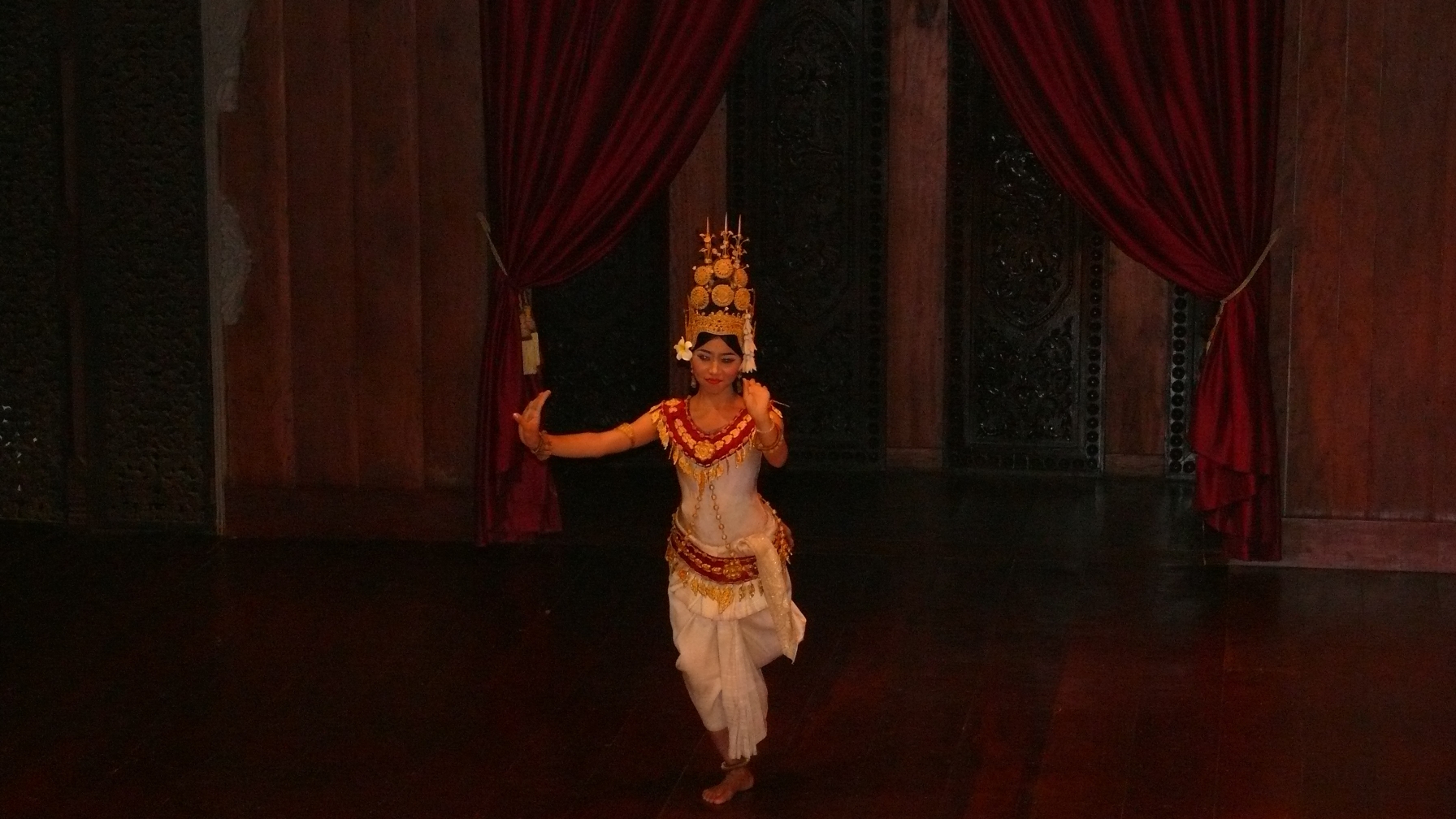 Der Abend heute ist klassisch touristisch. Es gibt Massenbuffet mit Apsaratänzen. Apsaras sind in der hinduistischen und teilweise auch in der buddhistischen Mythologie halb menschliche und halb göttliche Frauen, die im Palast des Gottes Indra leben. Besondere Bedeutung erhielten sie in der Khmer-Mythologie zur Zeit des Reiches Kambuja, dessen Hauptstadt Angkor war. Die Apsaras präsentierten den Menschen von Kambuja die Tanzkunst. Auf vielen Reliefs in Angkor findet man ihre Darstellungen.