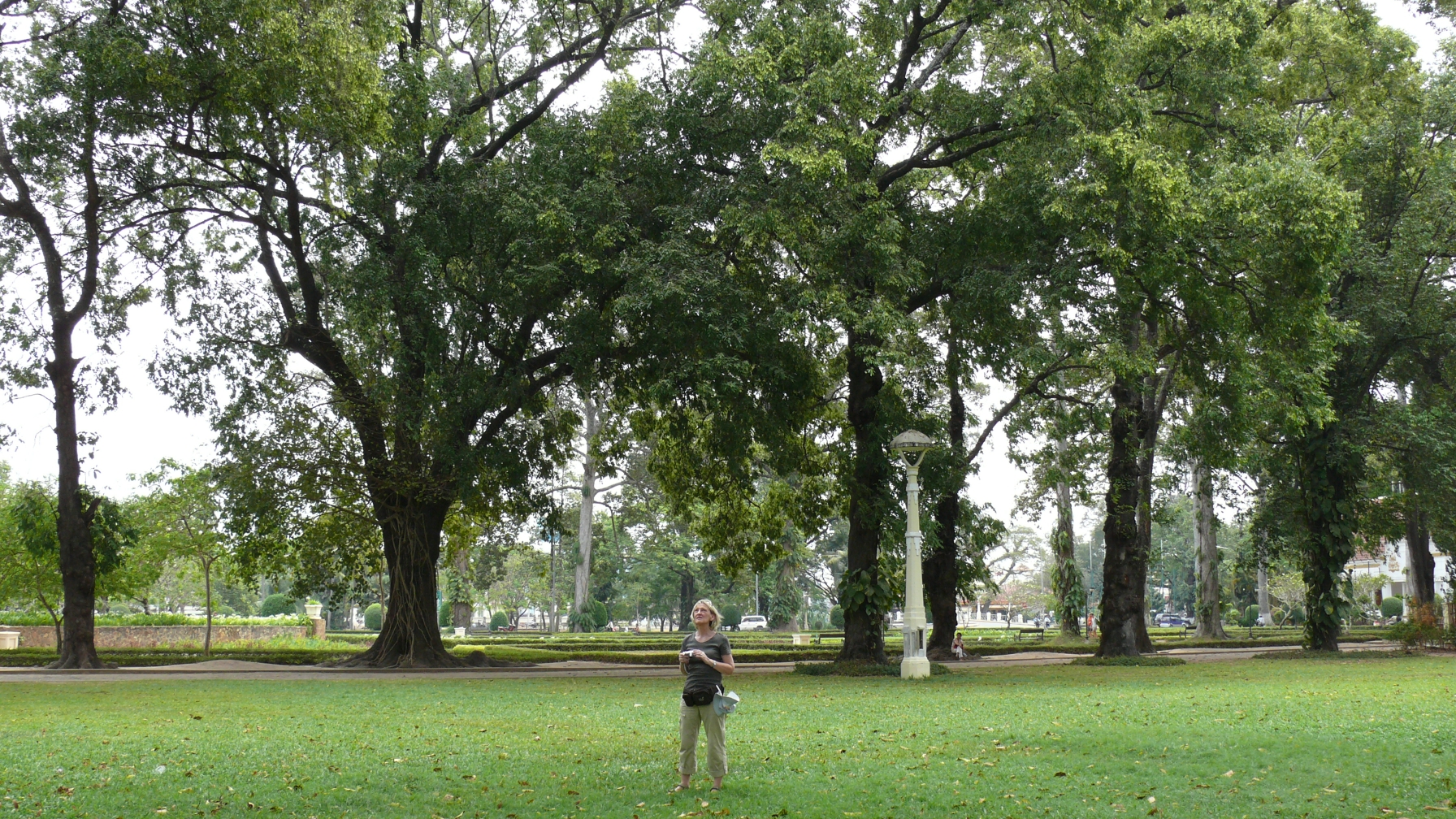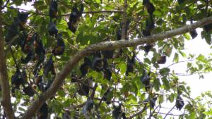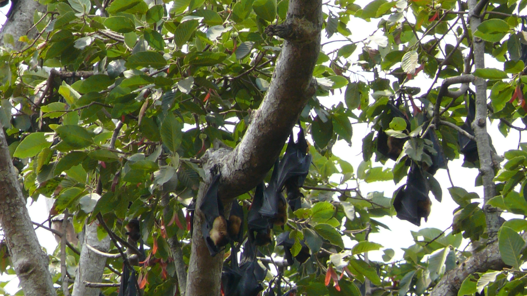 Lange halten wir uns in einem kleinen Park in der Nähe des Hotels auf. Hier stehen große Bäume, in denen Heerscharen von fliegenden Hunden hängen ...