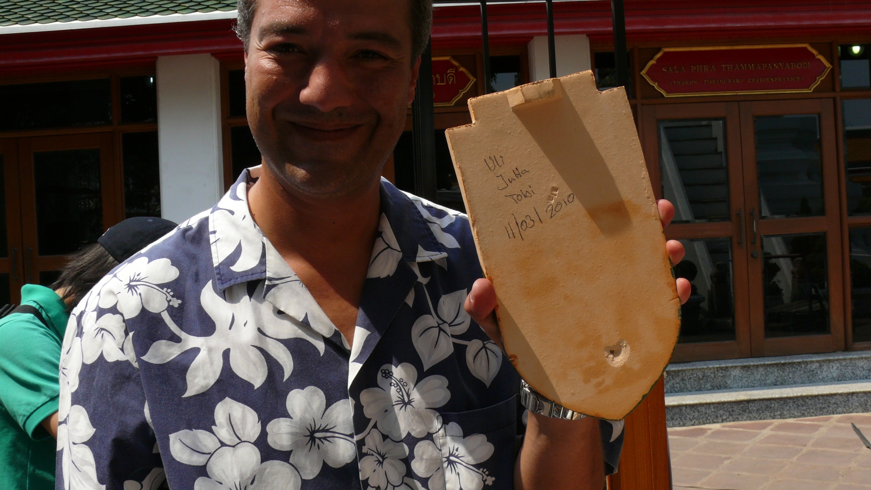 Tobi stiftet eine Dachschindel, die bei der Restaurierung des angrenzenden Klosters verwendet wird, und auf der wir uns verewigen.