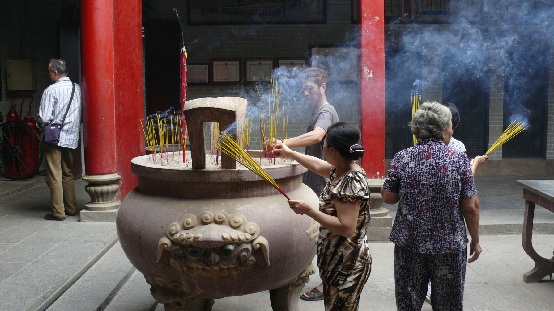 Der schönste und meist besuchte Tempel in Saigons Chinatown jedoch ist der Chua Thien Hau. Er ist der Gemahlin des Himmels (Thien Tau) und Schutzgöttin der Seefahrer und Fischer gewidmet. Besonders beeindruckend ist der reich verzierte Dachfirst. Hier werden Räucherstäbchen geopfert, und zahlreiche Räucherspiralen hängen an der Decke und tauchen die Anlage in einen diffusen Nebel. Diese Räucherspiralen werden im Tempel verkauft. Man versieht sie mit einem Wunsch für die Zukunft, und dann werden sie angezündet und aufgehängt. Unser Guide kauft eine Spirale für die Gruppe, mit der er uns Glück für die weitere Reise wünscht.