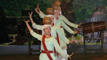Eine Lotusblüte bekommen wir auch zur Begrüßung im Angkor Village Theatre, in dem wir uns heute Abend Apsaratänze anschauen. Es ist deutlich stilvoller als die Veranstaltung gestern. Wir sitzen sehr angenehm im ersten Stock mit gutem Blick auf die Bühne, und auch das Essen ist sehr gut. Ein schöner Abschluss der Reise.