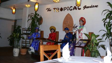 Das Abendessen findet im Tropical Garden statt, wiederum ein “typisches” vietnamesisches Restaurant, das von keiner Reisegruppe versäumt werden darf. Das Gebäude ist offen, was sicher bei schönem Wetter sehr angenehm ist, uns jetzt aber zwingt, unsere Jacken und Schals anzulassen. Das Essen ist aber gar nicht schlecht. Und dazu gibt es traditionelle Life-Musik, die für europäische Ohren doch eher gewöhnungsbedürftig ist. Erst als die Band “Que Sera” und “Auld Lang Syne” intoniert, taut die Gruppe am Nachbartisch auf und singt kräftig mit.